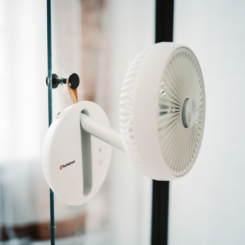 Humanas CoolAir F01 to kompaktowy wentylator, który może towarzyszyć Ci w każdym miejscu. Wbudowany akumulator ładowany przez port USB-C zapewnia nawet do 15 godzin bezprzewodowej i nieprzerwanej pracy. Urządzenie idealnie sprawdzi się nie tylko w domu lub biurze. Dzięki unikalnej składanej konstrukcji świetnie odnajdzie się również na wyjazdach i w podróży. Humanas CoolAir F01 oferuje 4-poziomową regulację mocy oraz wygodną obsługę za pomocą 2 przycisków. Innowacyjna obrotowa osłona zwiększa efektywność przepływu powietrza i równomiernie je rozprowadza. Przegubowe ramię umożliwia precyzyjne ustawienie urządzenia pod wybranym kątem. Nie zabrakło też specjalnego paska, dzięki któremu zainstalujesz wentylator na haczyku, uchwycie lub gałęzi.