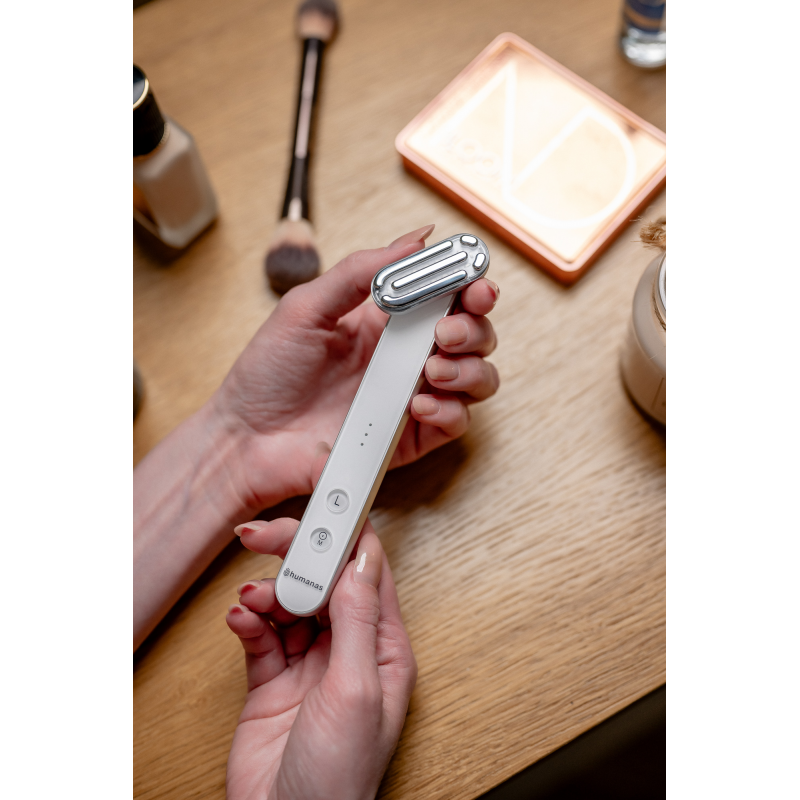 Niezależnie od tego ile masz lat, masażer Humanas Aurora precyzyjnie dostosuje się do potrzeb Twojej cery. Młodsze osoby, które pragną utrzymać zdrowy wygląd skóry, na pewno docenią funkcje rozgrzewające i wibracje soniczne, pomagające w głębszym wchłanianiu produktów pielęgnacyjnych. W przypadku skóry dojrzałej nieocenionym wsparciem będą technologia EMS i terapia czerwonym światłem. To doskonała broń walce z utratą jędrności, zmarszczkami i przebarwieniami.