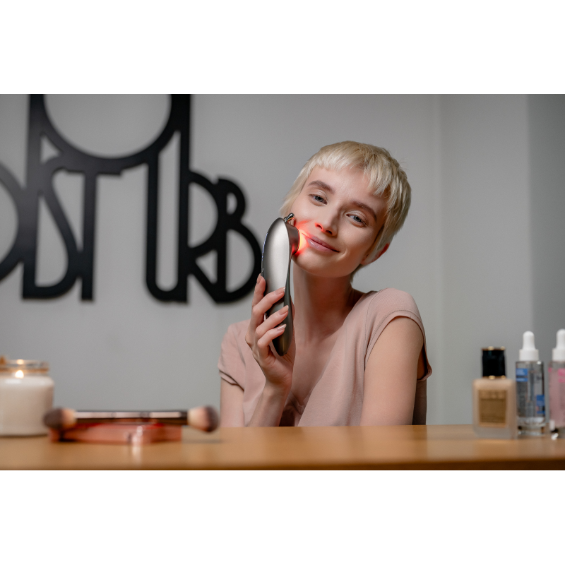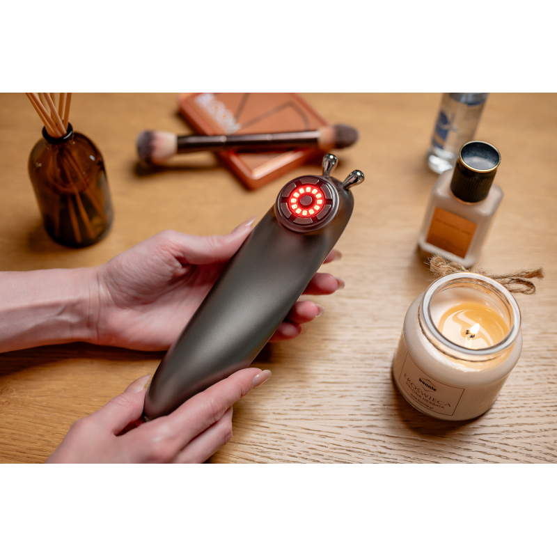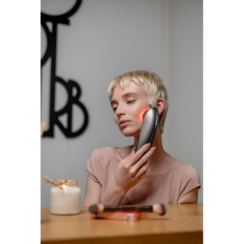 Światło czerwone to kolejna tajna broń w walce z oznakami starzenia się skóry, jaką oferuję masażer Humanas Serenum. Zastosowana technologia opiera się na wykorzystaniu wiązki o długości fali 630 nm, która przenika głęboko w skórę, stymulując naturalne procesy regeneracyjne. Światło czerwone pobudza produkcję kolagenu, co prowadzi do jeszcze większej poprawy ogólnego wyglądu cery. Działanie przeciwzapalne pomaga także w redukcji zaczerwienień oraz przyspiesza gojenie się mikrouszkodzeń skóry. Regularne stosowanie terapii światłem czerwonym poprawia wygląd twarzy, nadając jej zdrowy, młodzieńczy blask.