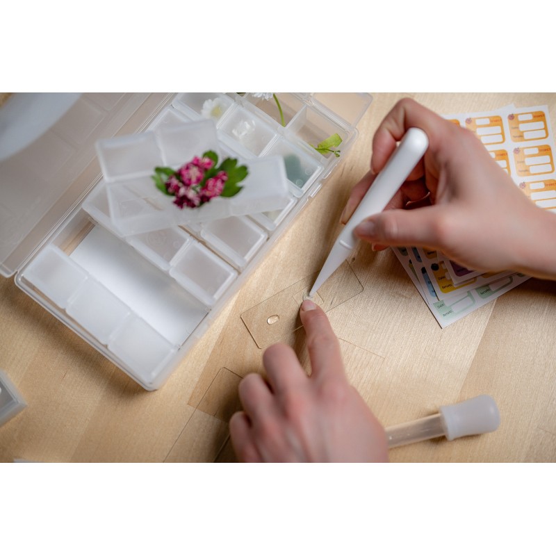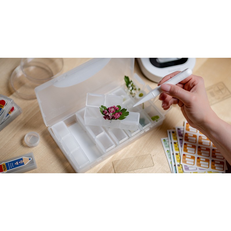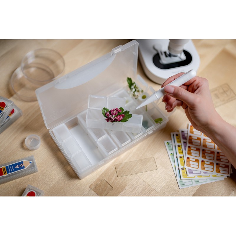 W zestawie znajdziesz też 10 gotowych preparatów zamkniętych w solidnych plastikowych pudełkach z przegródkami. Wśród nich znajdziesz: fragment mrówki, przekrój liścia sosny, przekrój zalążni lilii, przekrój łodygi dyni, przekrój podłużny nasionka kukurydzy, skórkę cebuli, pyłek sosny, odnóże pszczoły, skrzydło pszczoły oraz łuskę złotej rybki. Zestaw uzupełniono również o 10 pustych szkiełek nakrywkowych, w których umieścisz własne preparaty.
