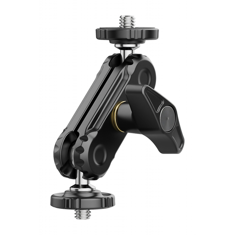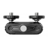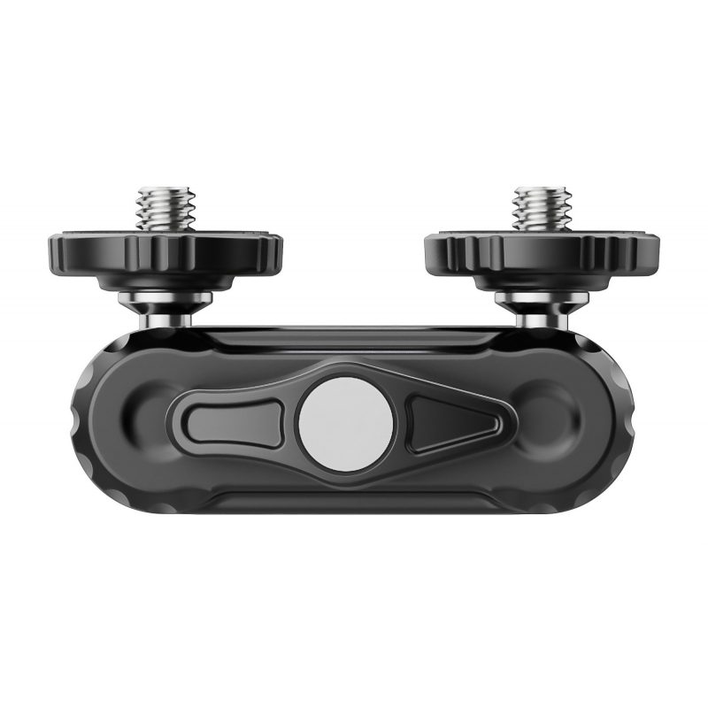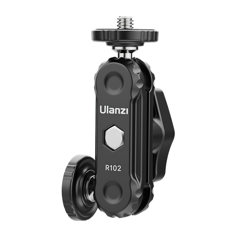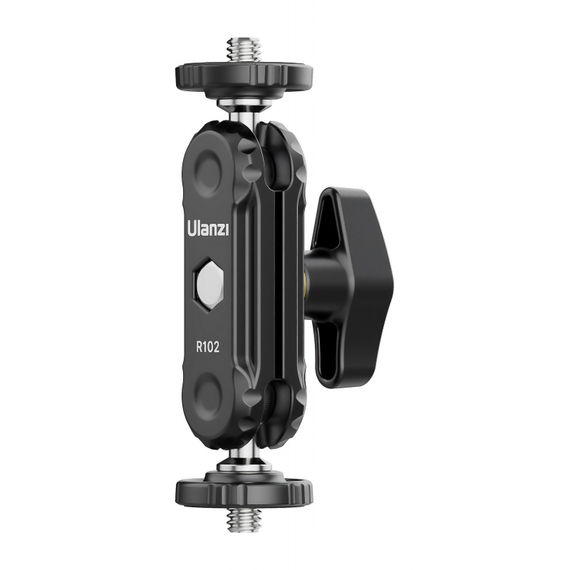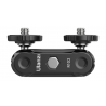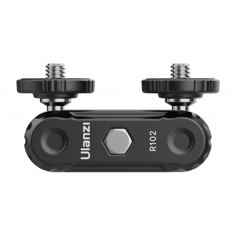 Uchwyt montażowy Ulanzi R102 oferuje dwa punkty montażu z męskim gwintem 1/4". Każdy z nich zainstalowano na niewielkiej głowicy kulowej. System szybkiego blokowania pozycji pozwoli unieruchomić mocowania za pomocą jednego pokrętła.
