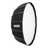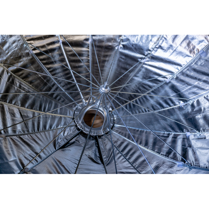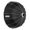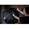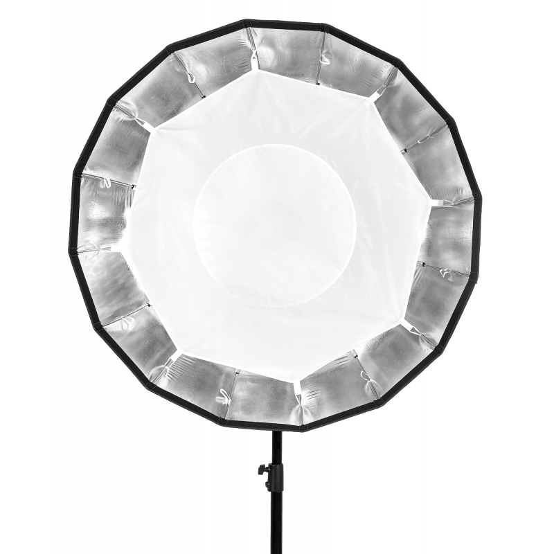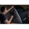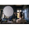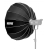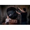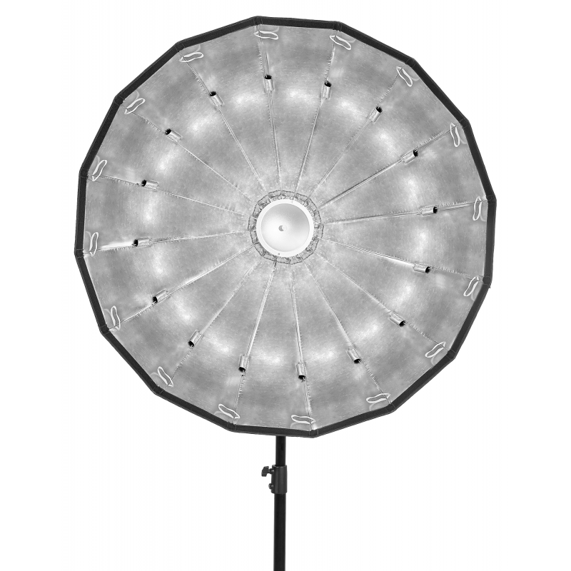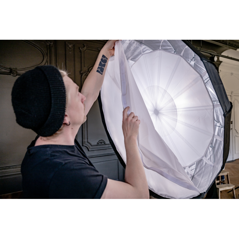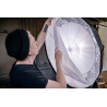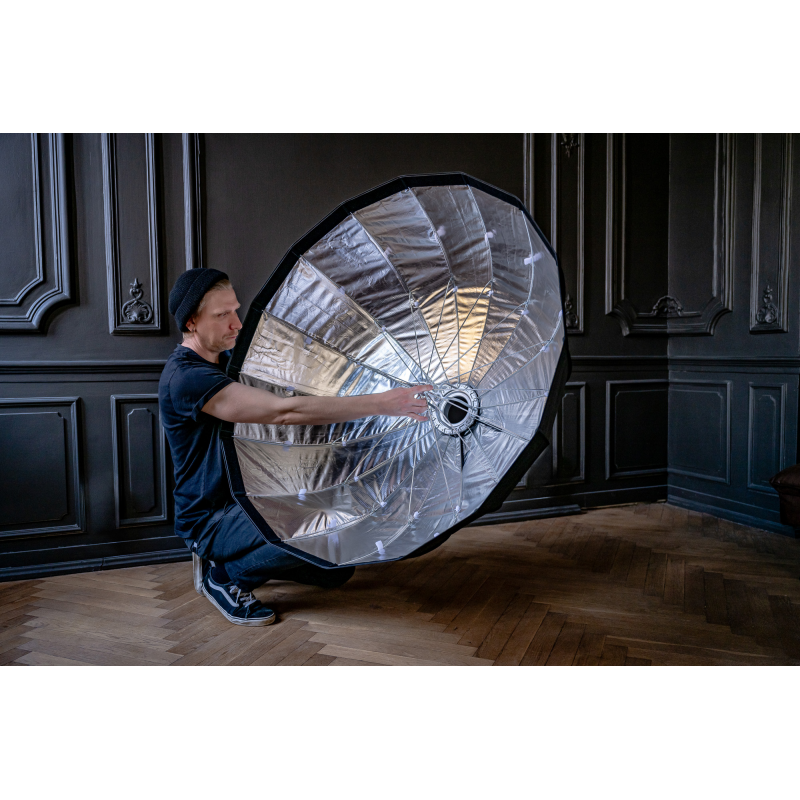 Softbox paraboliczny Newell 120 cm został wyposażony w nowoczesny system szybkiego montażu, który pozwala na błyskawiczne składanie i rozkładanie modyfikatora. Dzięki dopracowanemu mechanizmowi napinanie prętów jest banalnie proste, a ich blokada następuje automatycznie. Gdy sesja dobiega końca, wystarczy wcisnąć jeden przycisk, aby zwolnić zatrzaski i złożyć softbox. Cały mechanizm składania i rozkładania przypomina ten wykorzystywany w parasolkach. Z tym modyfikatorem możesz bezproblemowo pracować w dynamicznych warunkach, oszczędzając cenny czas.