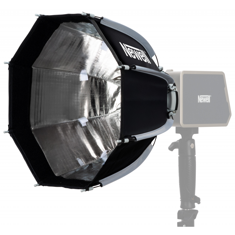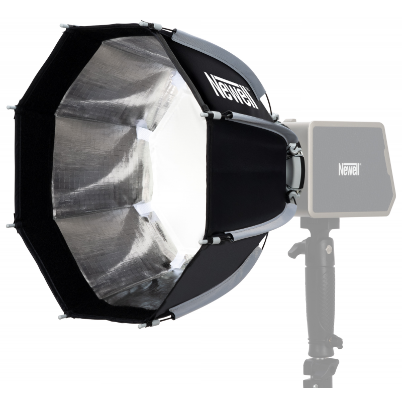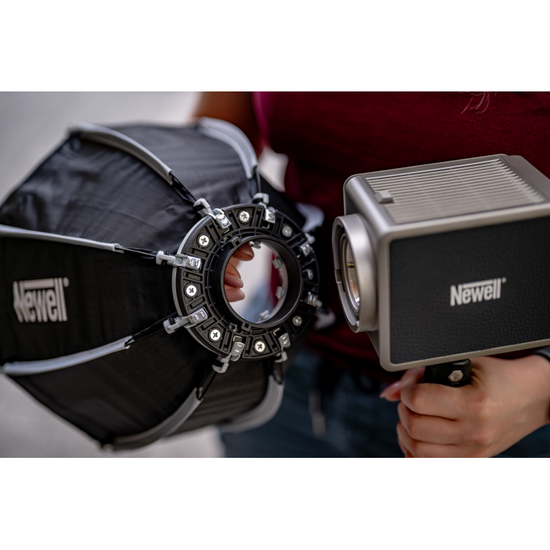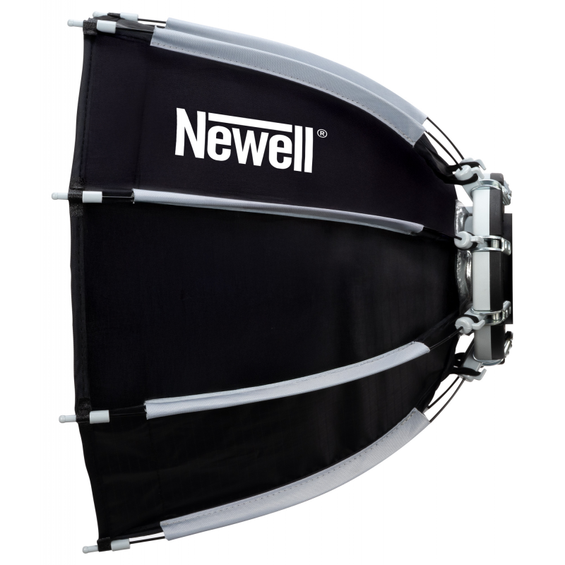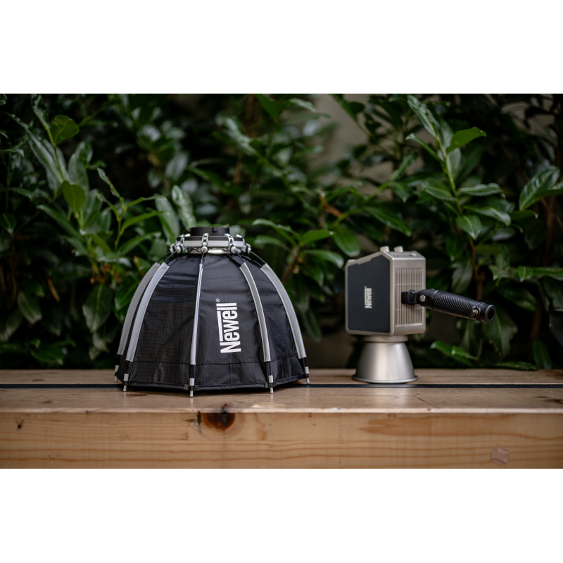 Prezentowany softbox oktagonalny Newell oferuje 30 cm średnicy po rozłożeniu. Taki modyfikator nie dominuje na planie zdjęciowym i nie zasłania kamery czy monitora. Na pewno docenisz go podczas pracy w ciasnych pomieszczeniach. To idealny kompromis pomiędzy mobilnością a funkcjonalnością – oferuje wystarczająco dużą powierzchnię, by zmiękczyć światło, ale jest na tyle mały, by zmieścić się nawet w bardzo małym studio.