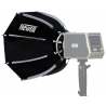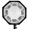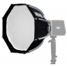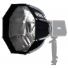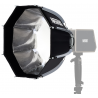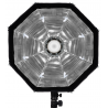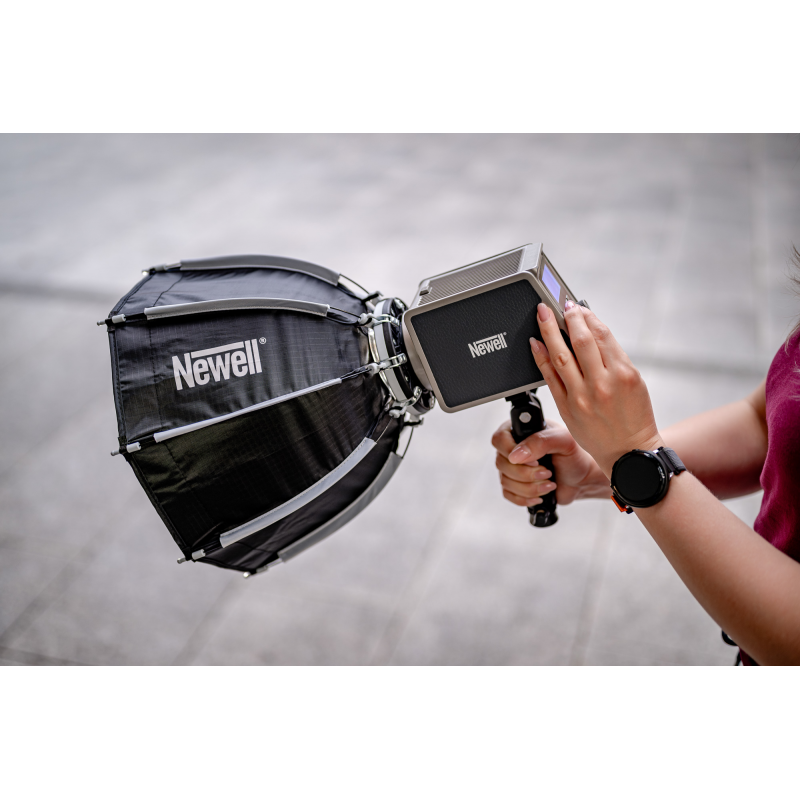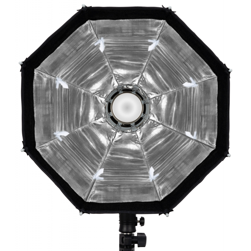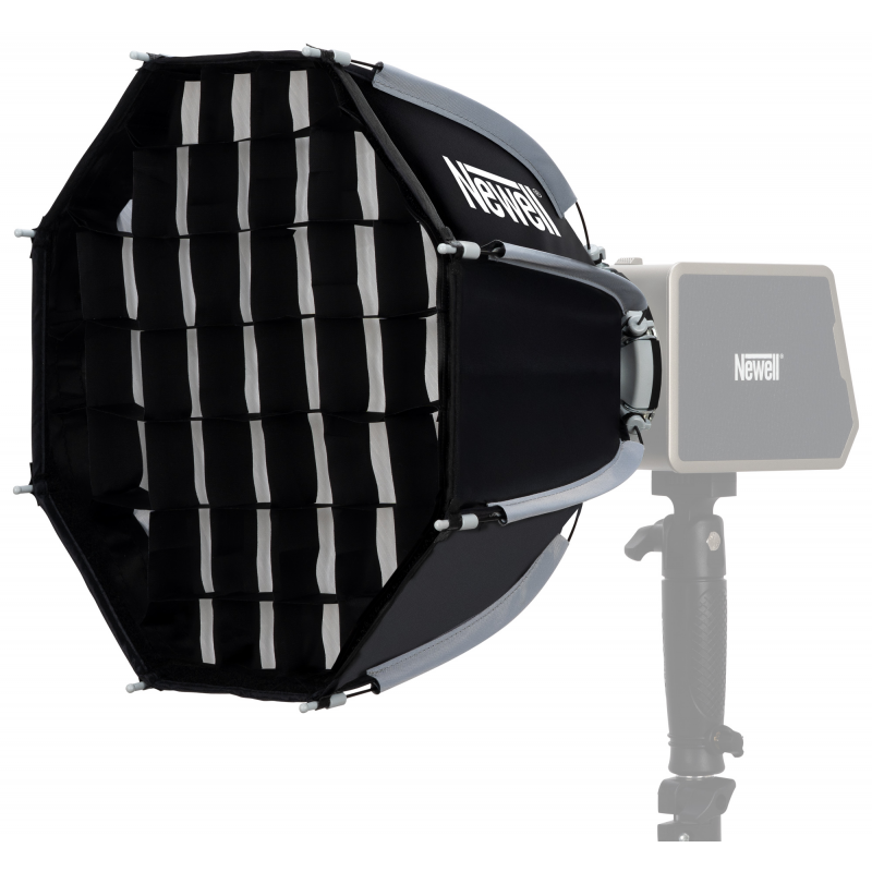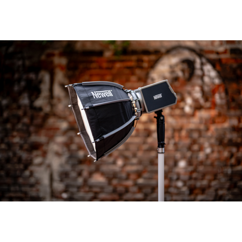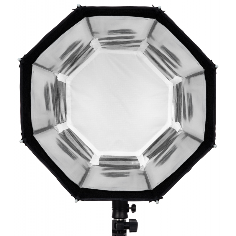 Prezentowany softbox oktagonalny Newell oferuje 30 cm średnicy po rozłożeniu. Taki modyfikator nie dominuje na planie zdjęciowym i nie zasłania kamery czy monitora. Na pewno docenisz go podczas pracy w ciasnych pomieszczeniach. To idealny kompromis pomiędzy mobilnością a funkcjonalnością – oferuje wystarczająco dużą powierzchnię, by zmiękczyć światło, ale jest na tyle mały, by zmieścić się nawet w bardzo małym studio.