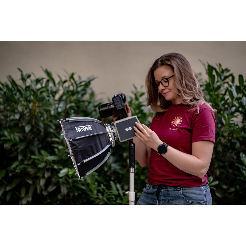 Newell 30 cm to kompaktowy softbox oktagonalny z mocowaniem Mini Bowens typ FM – idealny do fotografii portretowej, produktowej oraz contentu beauty. Dzięki średnicy 30 cm świetnie sprawdza się w małych przestrzeniach i przy zdjęciach z bliska. W zestawie znajdziesz dwa dyfuzory i grid, które zapewniają precyzyjną kontrolę nad światłem – od subtelnego rozproszenia po bardziej skupioną wiązkę. System „na klik” ułatwia szybkie rozkładanie, a torba umożliwia wygodny transport. Całość objęta jest 40-miesięcznym okresem ochrony serwisowej Newell. Softbox jest kompatybilny z kompaktowymi lampami Newell Zora.