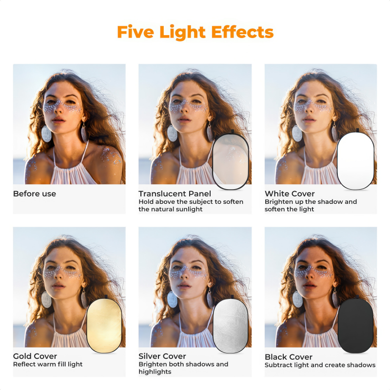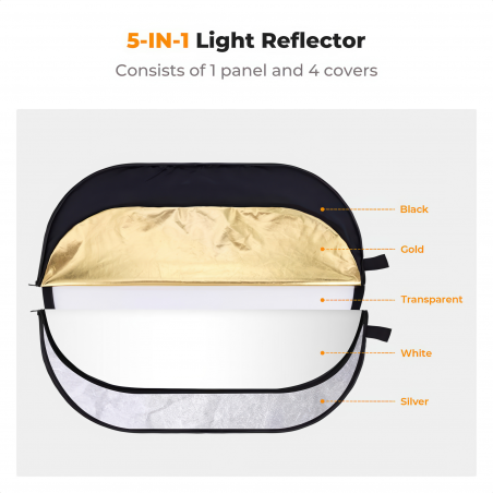 Blenda K&F Concept 5w1 - 90x60 cm oferuje pięć różnych efektów odbicia, które dostosujesz do swoich potrzeb, zdejmując lub zakładając dołączoną do zestawu nakładkę zapinaną na suwak. Oprócz klasycznego dyfuzora masz do dyspozycji następujące opcje: