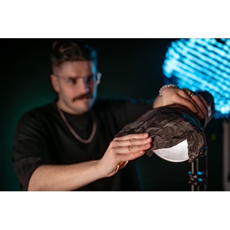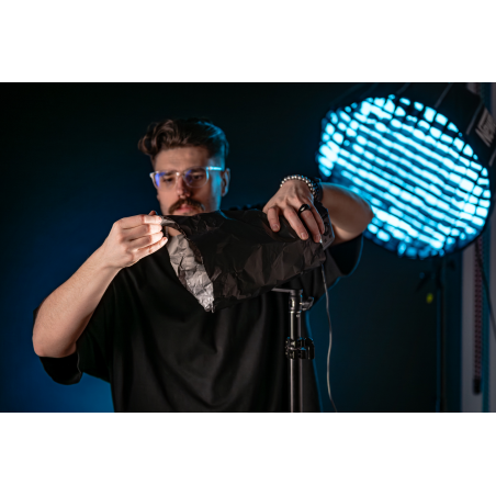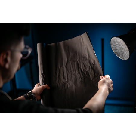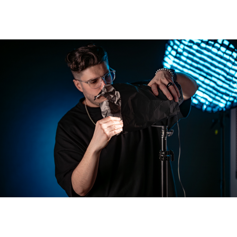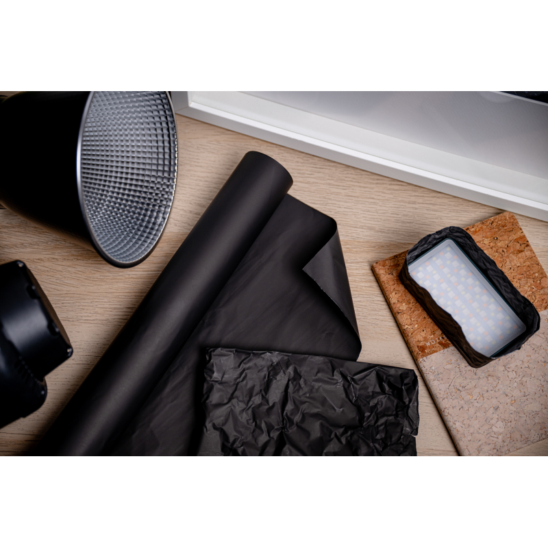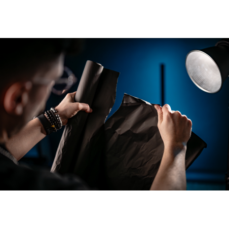 Grubość 55 mikronów (0,055 milimetra), to idealny balans pomiędzy plastycznością a wytrzymałością. Folia Newell Cinenoir łatwo się zgina, zwija i modeluje, dzięki czemu można szybko dopasować ją do lampy, statywu czy elementów scenografii. Po uformowaniu zachowuje nadany kształt, nie prostuje się samoczynnie i nie wymaga sięgania po dodatkowe uchwyty. To ogromne ułatwienie na planie zdjęciowym, gdzie liczy się czas, prostota i możliwość dokonywania szybkich korekt ustawienia światła.