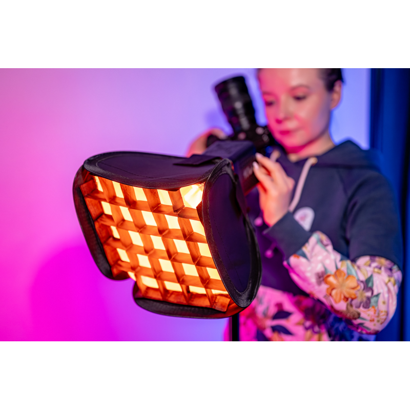 W zestawie z softboxem kwadratowym Newell 25 cm Mini Bowens znajdziesz również grid, który pozwala zawęzić kąt świecenia i zapobiega niekontrolowanemu rozlewaniu się światła na boki. To szczególnie przydatne podczas pracy w niewielkich pomieszczeniach, gdzie chcesz uniknąć odbić od ścian lub gdy zależy Ci na kinowym, skupionym świetle z charakterystycznymi cieniami.