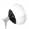 Unikalny kulisty kształt sferycznego softboxa Aputure Lantern 90 pozwoli Ci uzyskać miękkie i przyjemne dla oka światło o promieniu 270º. Strata światła na dyfuzorze wynosi tu - 1 EV. Modyfikator z powodzeniem wykorzystasz zarówno w studiu fotograficznym, jak i na planie filmowym.