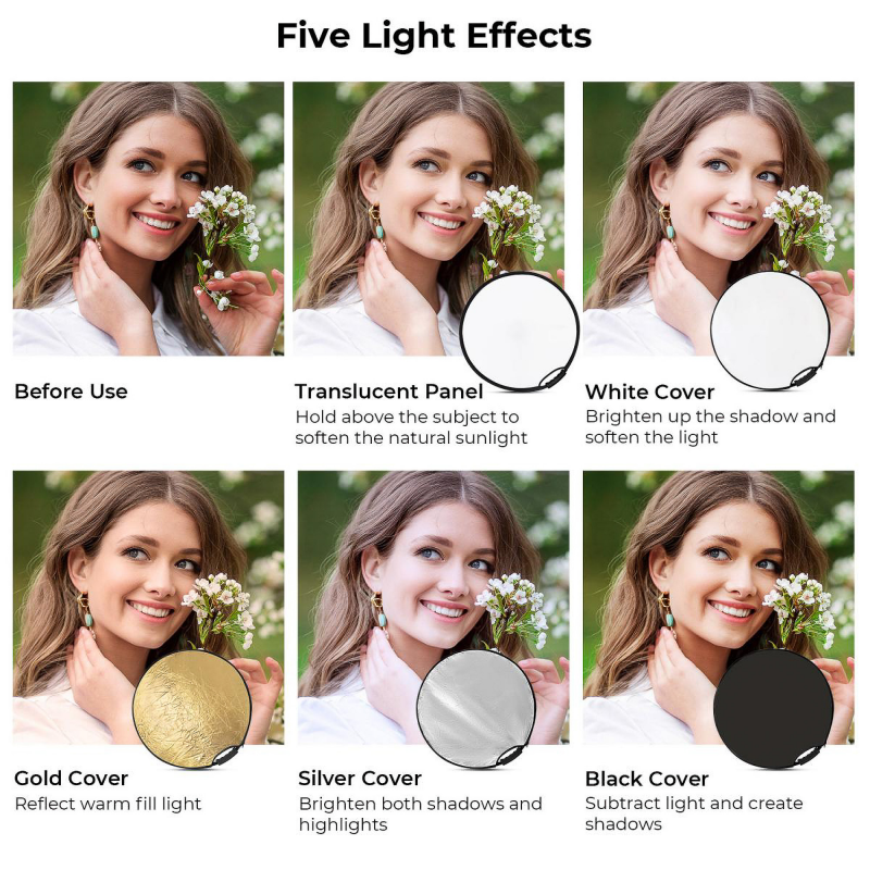 Blenda K&F Concept 5w1 - 60 cm oferuje pięć różnych efektów odbicia, które dostosujesz do swoich potrzeb, zdejmując lub zakładając dołączoną do zestawu nakładkę zapinaną na suwak. Oprócz klasycznego dyfuzora masz do dyspozycji następujące opcje: