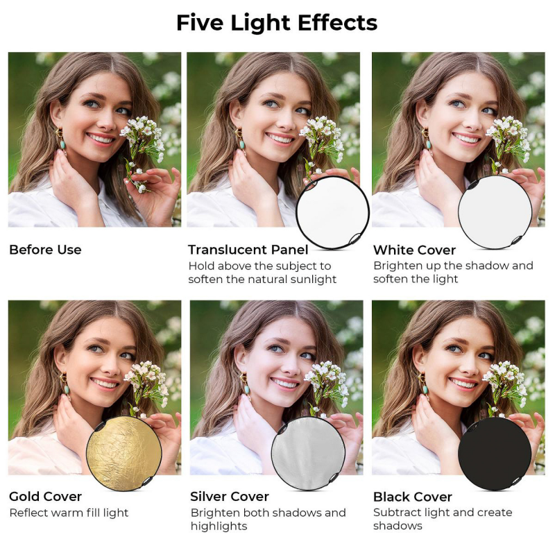 Blenda K&F Concept 5w1 - 110 cm oferuje pięć różnych efektów odbicia, które dostosujesz do swoich potrzeb, zdejmując lub zakładając dołączoną do zestawu nakładkę zapinaną na suwak. Oprócz klasycznego dyfuzora masz do dyspozycji następujące opcje: