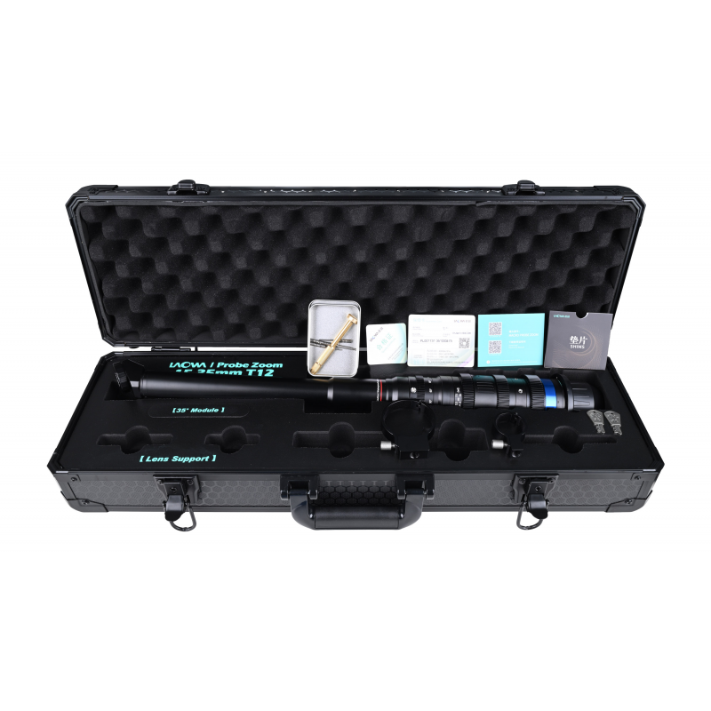 Laowa Probe Zoom 15-35 mm T12 dostarczany jest w solidnej walizce zamykanej na klucz, która zapewnia maksymalne bezpieczeństwo podczas transportu i przechowywania. Jej wnętrze wypełniono pianką z precyzyjnie wyciętymi przegródkami, które idealnie dopasowują się do kształtu obiektywu i chronią go przed wstrząsami oraz uszkodzeniami mechanicznymi. W walizce znajdziesz również obejmy z gwintem do montażu obiektywu na szynie stabilizacyjnej, co ułatwia integrację z rigami filmowymi i systemami wsparcia. Dołączono również zestaw kluczy do walizki, precyzyjne śrubokręty oraz podkładki pod bagnet („shims"), które pozwalają na dokładną regulację ustawień ostrości – „back focus" i „front focus".