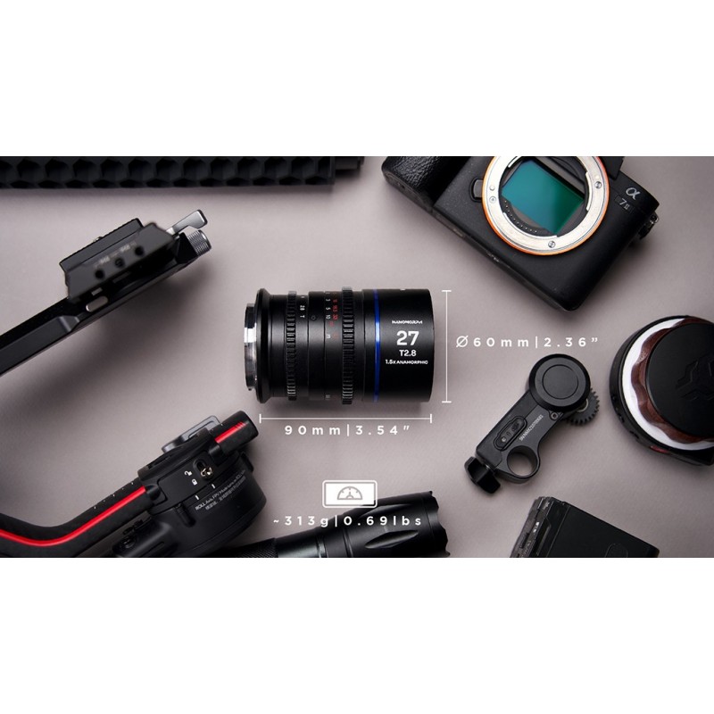 Nanomorph 27 mm T2,8 1,5X S35 to najszerszy przedstawiciel innowacyjnej serii anamorficznych obiektywów filmowych od Venus Optics Laowa. Prezentowany model jest kompatybilny z aparatami i kamerami wyposażonymi w mocowanie Sony E.