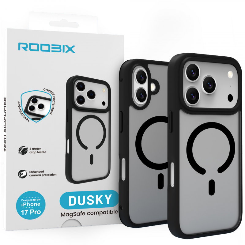 Czarne etui Roobix Dusky MagSafe do iPhone 17 Pro wyróżnia się eleganckim, satynowym wykończeniem, które nadaje mu unikalny charakter. Półprzezroczyste plecki subtelnie ukazują kontury i kolor telefonu, jednocześnie dodając mu charakteru. To doskonałe rozwiązanie dla osób, które cenią stylowe akcesoria i chcą, by ich iPhone dobrze się prezentował i był odpowiednio chroniony. Minimalistyczne wzornictwo sprawia, że etui pasuje zarówno do garnituru, jak i codziennego, swobodnego stylu.