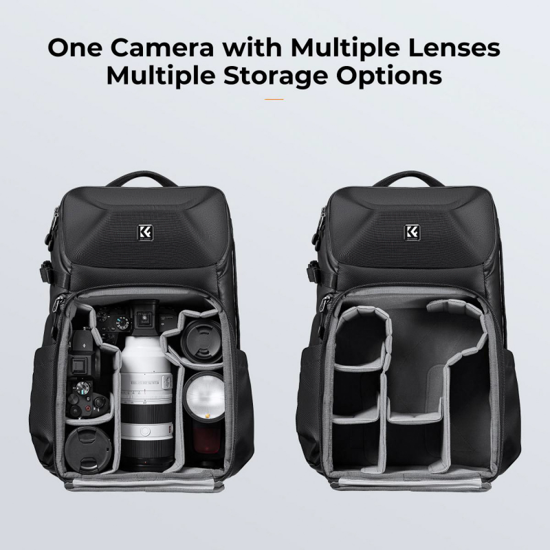 W zestawie z plecakiem K&F Concept Beta Backpack 20 l znajdziesz sześć przegród, które możesz dowolnie zamieniać miejscami, w zależności od tego, jaki sprzęt akurat Ci towarzyszy. Wkładki o różnych kształtach pozwalają na swobodne zorganizowanie wewnętrznej przestrzeni, umożliwiając wygodny transport aparatu, lampy błyskowej, obiektywów, drona, gimbala i innych narzędzi pracy fotografa lub filmowca. Dzięki temu plecak jest zawsze dostosowany do Twoich potrzeb.