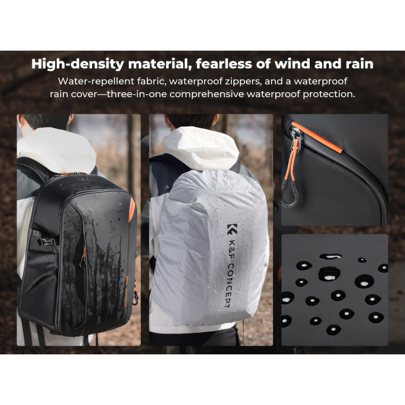 Plecak K&F Concept Nature Wander 09 25 l wykonano z trwałych materiałów odpornych na przetarcia i zachlapania. Bryzgoszczelne zamki błyskawiczne chronią zawartość wnętrza nawet w trudnych warunkach atmosferycznych. Nieważne, czy fotografujesz w górskiej mgle, podczas deszczu czy w wilgotnym lesie – Twój sprzęt pozostanie suchy i bezpieczny.