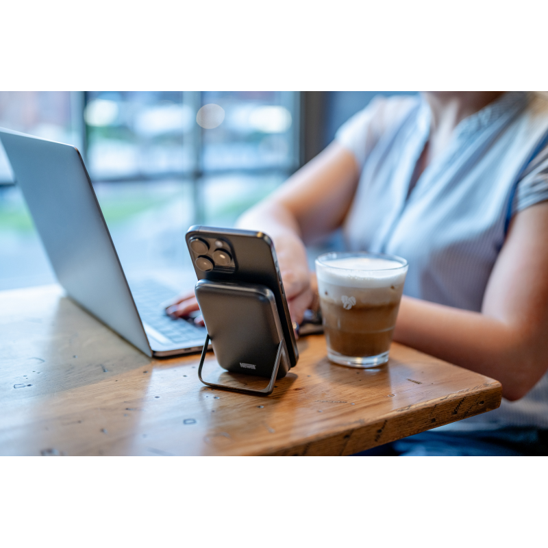 Power Bank Newell MS-10000 to idealny wybór dla posiadaczy iPhone'ów wspieranych przez standard MagSafe, który zapewnia magnetyczne połączenie ze smartfonem i bezprzewodowe ładowanie. Zastosowanie portu USB-C oraz kompatybilność z technologią Power Delivery (maks. 20 W) umożliwia również wygodne i szybkie ładowanie smartfonów z Androidem, słuchawek, aparatów fotograficznych i setek innych urządzeń. Power bank oferuje 10000 mAh pojemności. Na jego obudowie umieszczono podświetlany wskaźnik, wyświetlający poziom dostępnej energii w procentach. Zintegrowana podstawka odchylana w zakresie 45 stopni pozwala zmienić urządzenie w ergonomiczną stację ładowania. Urządzenie jest kompatybilne z trybem czuwania oferowanym przez system iOS. Produkt objęty jest 40-miesięczną gwarancją producenta.