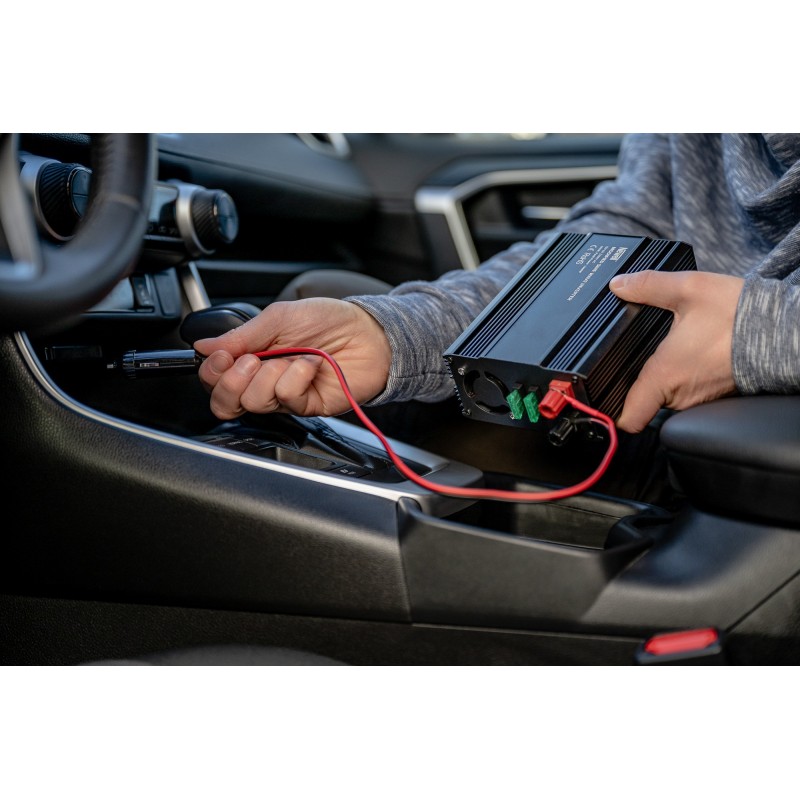 Przetwornica napięcia Newell z modyfikowaną sinusoidą - 12 V / 230 V, 500 W to idealny wybór dla osób, które często podróżują lub chcą korzystać z ulubionych urządzeń wszędzie tam, gdzie nie ma dostępu do tradycyjnych gniazdek elektrycznych. Dzięki niej Twoim uniwersalnym źródłem zasilania stanie się akumulator lub samochodowa zapalniczka. Urządzenie wyposażono w 1 tradycyjne gniazdko elektryczne (standard E) oraz 1 gniazdo USB-A. Do przetwornicy z łatwością podłączysz takie urządzenia jak grzałki, laptopy, smartfony, tablety, szlifierki i wiele innych. Maksymalna moc użytkowa inwertera wynosi 500 W. W zestawie, oprócz zwykłych przewodów i kabla do gniazda zapalniczki, znajdziesz wygodne w użyciu kable z zaciskami (klemy), które dodatkowo ułatwią podłączanie urządzenia do akumulatorów.