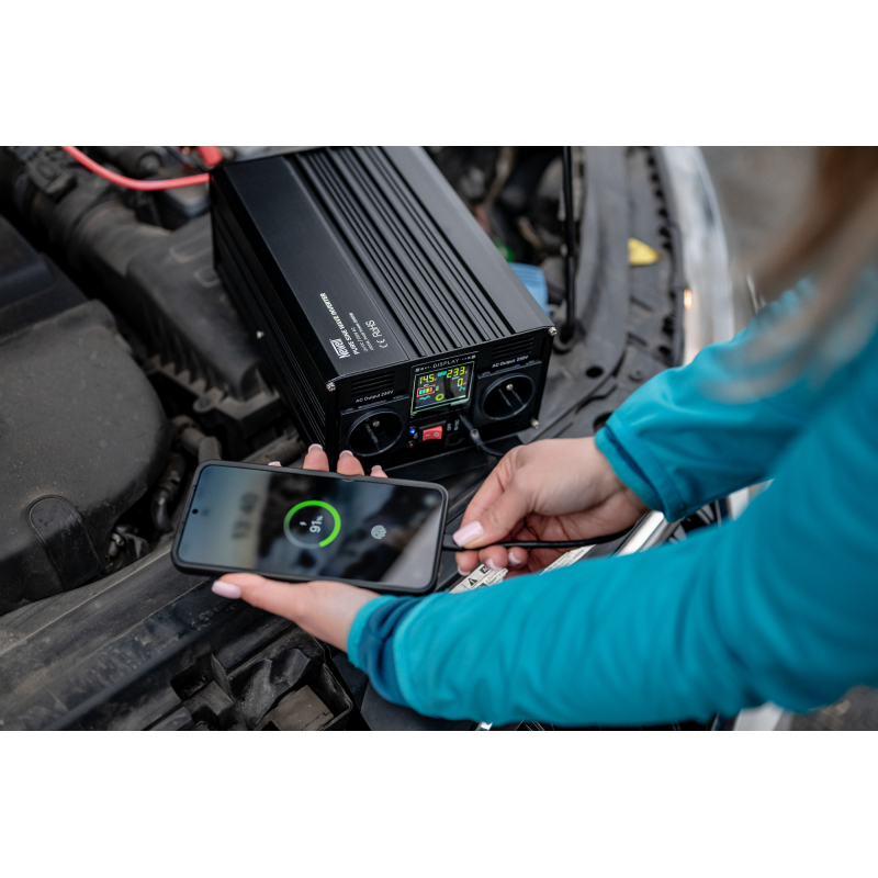 Przetwornica napięcia Newell z czystą sinusoidą - 12 V / 230 V, 1000 W to zaawansowany technologicznie falownik, który zapewnia niezawodne zasilanie dla urządzeń wymagających napięcia przemiennego 230 V. Dzięki niemu możesz korzystać z 2 gniazdek elektrycznych i portu USB wszędzie tam, gdzie dostęp do prądu jest ograniczony, a jego jedynym źródłem jest akumulator 12 V. Bezpieczeństwo pracy zapewniają odpowiednie zabezpieczenia – przed przepięciem, zwarciem, przegrzaniem i przeładowaniem, a także certyfikaty CE i RoHS. Urządzenie posiada inteligentny system chłodzenia, podświetlany ekran oraz kompaktową, wytrzymałą obudowę. W zestawie znajdziesz również kable do akumulatora z końcówkami oczkowymi.