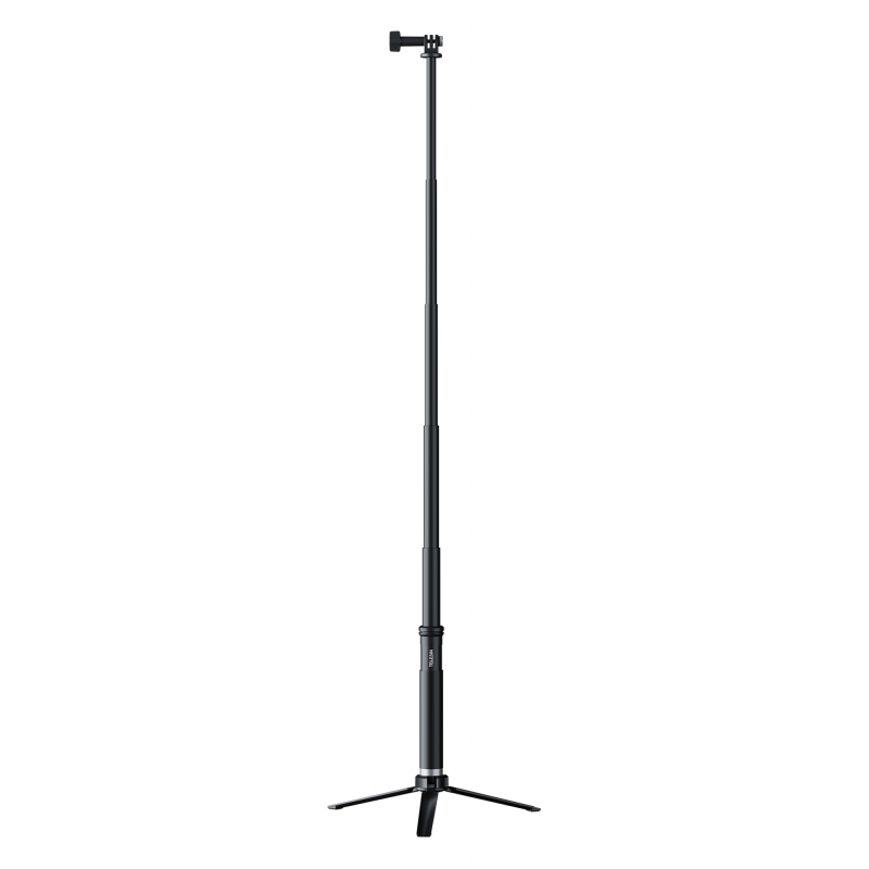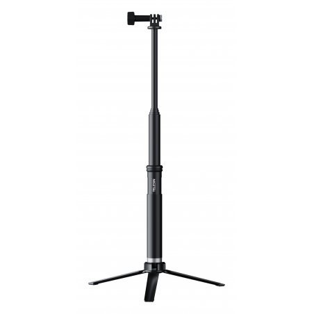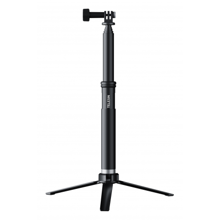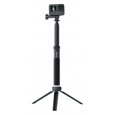 Telesin GP-MNP-090-S to pięciosekcyjny kijek selfie wykonany z aluminium lotniczego. Jego długość może wynieść od 20 do 90 cm. Do zestawu dołączono ministatyw. Po przykręceniu go do selfie sticka, jego złożone nóżki biegną wzdłuż uchwytu, poprawiając chwyt i nie zajmując dodatkowego miejsca. Mocowanie GoPro, które wieńczy całą konstrukcję, pozwala pochylić kamerę sportową w zakresie 180°. Uchwyt na smartfon możesz zainstalować zarówno na rączce (jako podgląd dla sparowanej kamery), jak i na końcu selfie sticka (adapter na gwint 1/4" w zestawie). Całość waży jedynie 150 gramów.