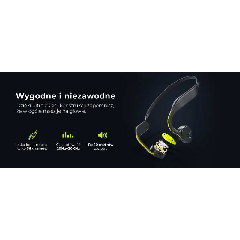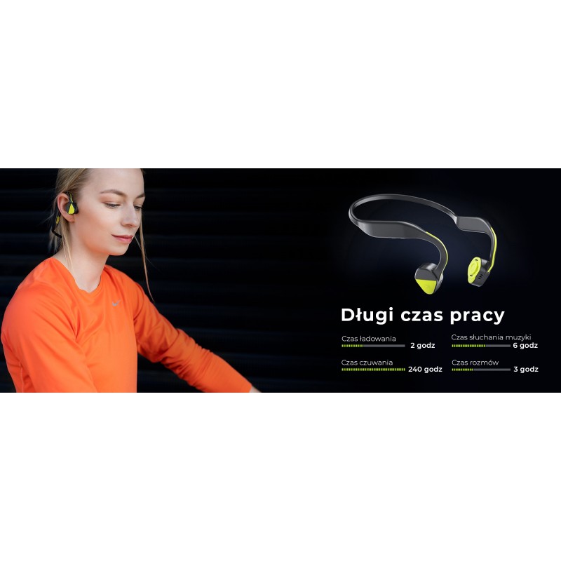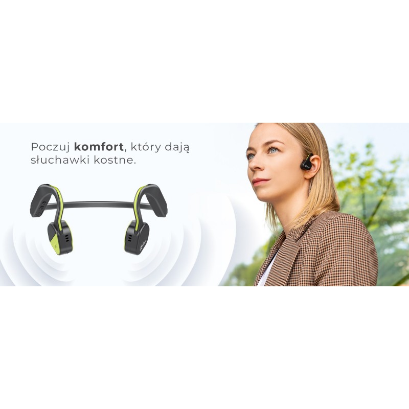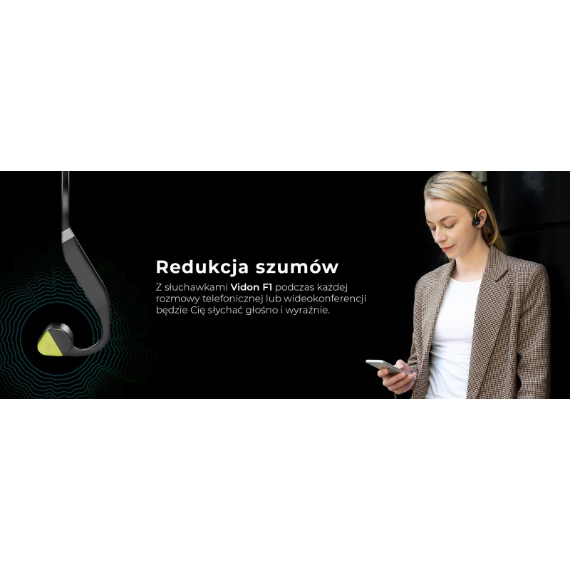 Vidonn F1 to nowoczesne słuchawki stworzone z myślą o osobach aktywnych, które biegają, wspinają się lub jeżdżą na rowerze. Innowacyjna technologia przewodnictwa kostnego, którą oferują, sprawdzi się wszędzie tam, gdzie podczas użytkowania zależy Ci na tym, aby wciąż docierały do Ciebie dźwięki z otoczenia. Zadbaj o swoje bezpieczeństwo, nie rezygnując z wysokiej jakości brzmienia! Ergonomiczna konstrukcja słuchawek zapewnia wygodne noszenie, a lekkie materiały sprawią, że nie raz zdarzy Ci się zapomnieć o tym, że masz je na głowie. Wbudowany akumulator zapewnia do 6 godzin pracy na jednym ładowaniu. Słuchawki spełniają również normę IP55, co oznacza, że są odporne na pot, wilgoć i zachlapania. Dzięki redukcji szumów model ten świetnie sprawdzi się również podczas prowadzenia rozmów!