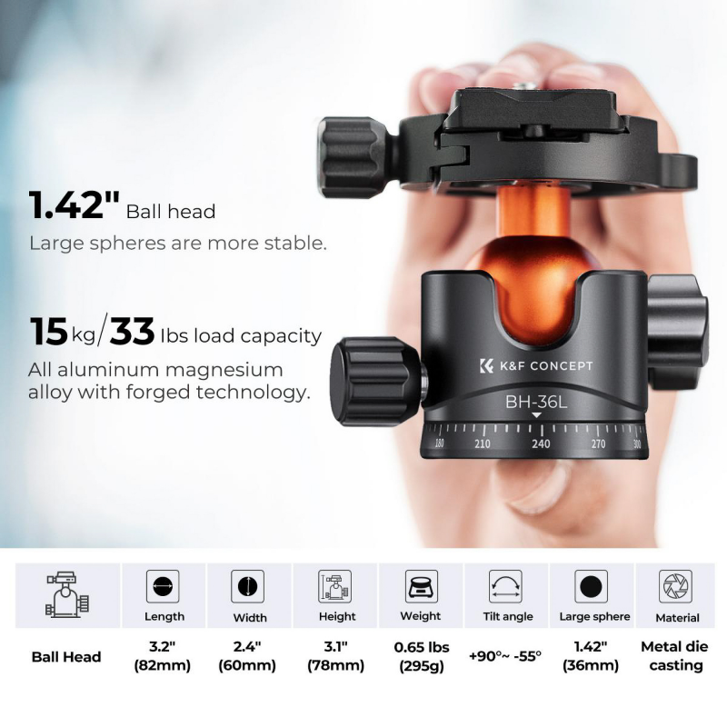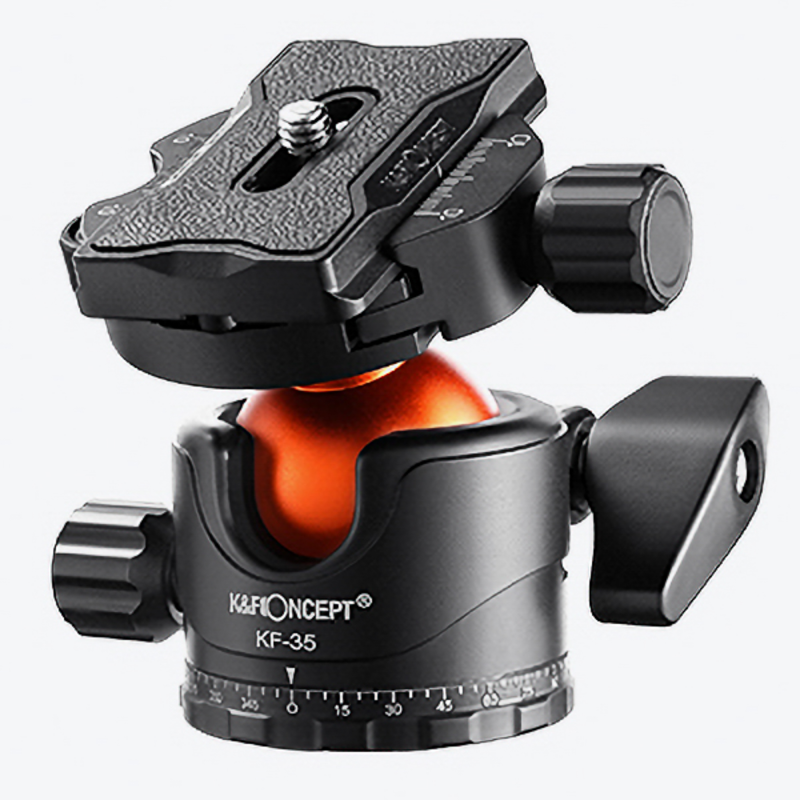 W zestawie ze statywem K&F Concept M1 znajdziesz zaawansowaną głowicę kulową BH-36L, wykonaną z trwałego aluminium, która oferuje udźwig do 15 kg. Kula o średnicy 36 mm gwarantuje płynność ruchów, co jest nieocenione przy tworzeniu ujęć panoramicznych oraz pracy z cięższym sprzętem. Na pokładzie nie zabrakło też precyzyjnej podziałki oraz poziomnicy bąbelkowej.