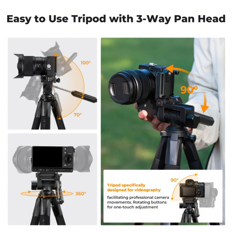 W zestawie ze statywem video K&F Concept S254A3 otrzymujesz solidną głowicę K&F Concept BV01, zaprojektowana z myślą o płynnych ruchach kamery, aparatu lub smartfona. Umożliwia obrót o 360° w osi panoramowania, pochylenie w zakresie od -70° do +100°, a także błyskawiczną zmianę orientacji z poziomej na pionową. Płytka szybkiego montażu z gwintem 1/4” pozwala sprawnie instalować na głowicy różne urządzenia – od aparatów, przez lampy LED, aż po uchwyty na telefon. Ergonomiczne pokrętła gwarantują pełną kontrolę nad każdym ruchem.