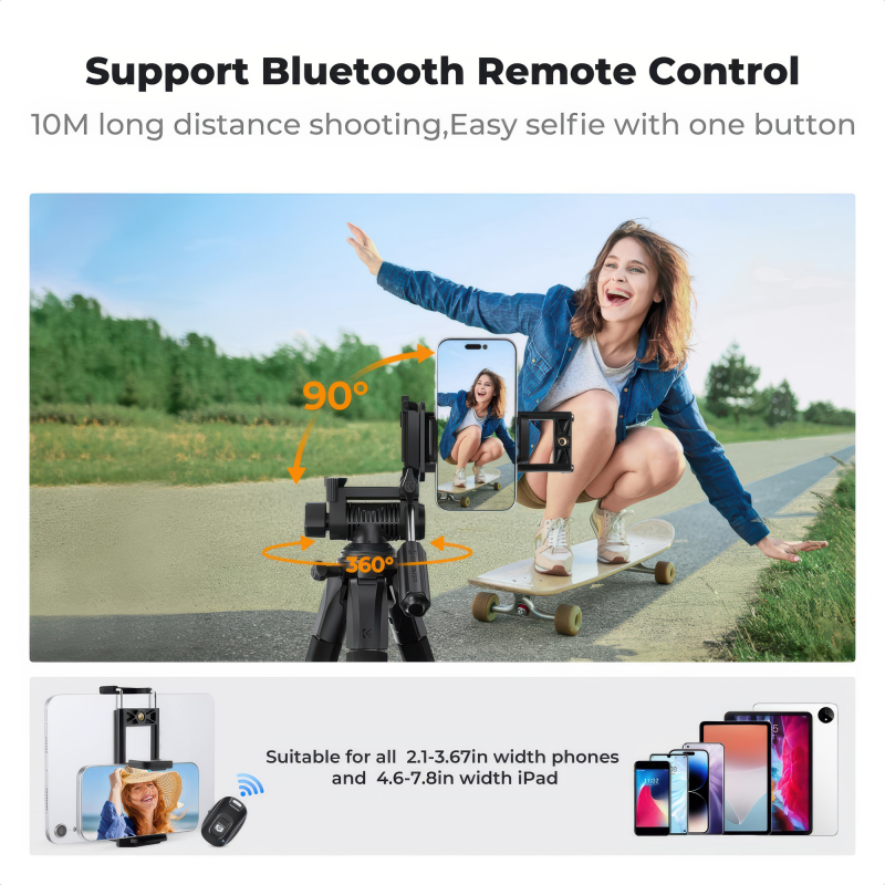 Statyw video K&F Concept S255A3 z głowicą BV01 to rozwiązanie dla twórców, którzy sięgają po różne narzędzia. Właśnie dlatego do zestawu dołączono uniwersalny uchwyt zaciskowy pasujący do urządzeń mobilnych o szerokości od 5,3 do 9,3 cm (smartfony) i od 11,7 do 19,8 cm (tablety). Oznacza to kompatybilność z setkami sprzętów różnych marek – bez konieczności sięgania po dodatkowe akcesoria. Mocowanie jest solidne i bezpieczne, gotowe do działania od razu po wyjęciu z opakowania.