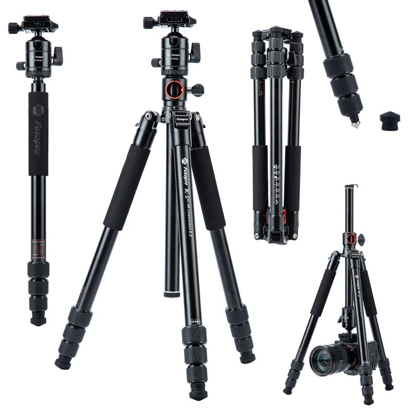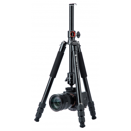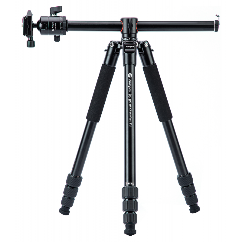 Fotopro X-go HR Chameleon E2 to wszechstronny aluminiowy statyw stworzony przede wszystkim dla fotografów produktowych, makro i krajobrazowych. Oferuje udźwig do 8 kg i wysokość roboczą od 13,4 cm do 158,7 cm. Jego kolumna centralna może zostać ustawiona w poziomie, co świetnie sprawdzi się w fotografii „flat lay”. Zarówno statyw, jak i głowica oferują niezależne podziałki ułatwiające precyzyjne kadrowanie. Możesz go również błyskawicznie przekształcić w monopod o maks. długości 131,7 cm. Solidną blokadę gwarantują obrotowe zaciski. Komfort trzymania poprawiają piankowe okładziny. Gumowe stopki można zamienić w kolce do pracy w terenie. Wysuwany hak pozwala dociążyć konstrukcję plecakiem dla większej stabilności. Całość waży zaledwie 1,5 kg.