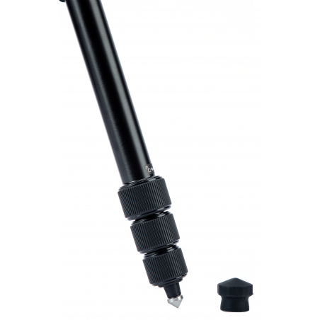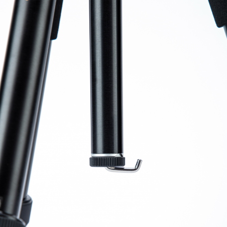 Gumowe stopki statywu Fotopro X-go HR Chameleon E2 można zamienić w metalowe kolce, dopasowując konstrukcję do trudniejszego podłoża. Na gładkich powierzchniach guma zapewnia przyczepność i chroni parkiet przed zarysowaniami. Z kolei kolce wykorzystywane w terenie wbijają się w ziemię, piasek czy śnieg, gwarantując stabilność. Wysuwany hak w dolnej części kolumny centralnej pozwala dociążyć statyw plecakiem lub torbą fotograficzną, co jest szczególnie przydatne podczas pracy w wietrznych warunkach lub przy montażu cięższych obiektywów.