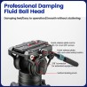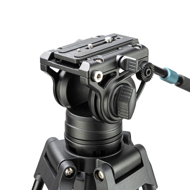 Głowica, jaką oferuje statyw video Fotopro DV-3 oferuje dwie płynnie działające osie pracy – pochyłu oraz panoramowania. Obie wyposażono w niezależne blokady, dzięki którym żaden przypadkowy ruch nie zakłóci zaplanowanego ujęcia. W celu poprawy komfortu użytkowania oś pochyłu wyposażona została również w regulowany system równoważenia kamery. W zależności od ciężaru wykorzystywanego sprzętu perfekcyjnie dopasujesz opór ruchów, ułatwiając tym samym wygodną kontrolę pracy urządzenia. Długa rączka zakończona antypoślizgowym uchwytem, którą można zainstalować po lewej i po prawej stronie głowicy, pomaga precyzyjnie zarządzać ruchami kamery. Można ją również szybko zdemontować na czas transportu. Posiada również regulowaną długość.