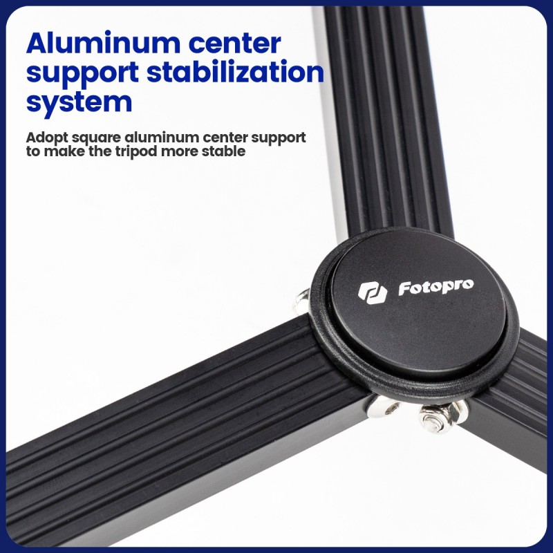 Nóżki statywu wykonano z wysokiej jakości aluminium zapewniającego wytrzymałość i pełną stabilność. Regulowana centrala pozwala perfekcyjnie dopasować środek ciężkości statywu do nietypowych obiektywów, dużych kamer filmowych lub sytuacji, gdy sprzęt ustawiony jest w nietypowej pozycji. Unikalna konstrukcja modelu Fotopro DV-3A sprawdzi się zarówno w studiu i w domu, jak i podczas zdjęć plenerowych. Gumowe antypoślizgowe nóżki można w łatwy sposób zdemontować.