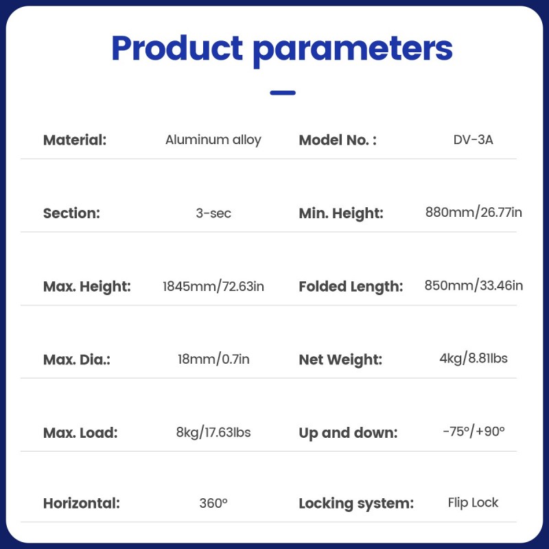 Trzy sekcje nóg statywu video Fotopro DV-3A blokowane są za pomocą niezawodnego i szybkiego w użyciu systemu zaciskówFlip-lock. Takie rozwiązanie pozwoli w ciągu kilku sekund precyzyjnie dostosować ich długość do bieżących potrzeb i szybko przygotować się do pracy z kamerą lub aparatem. W zależności od potrzeb wysokość robocza statywu może wynieść od 88 cm do 184 cm. Zakres ten umożliwi tworzenie kreatywnych ujęć z różnej perspektywy.