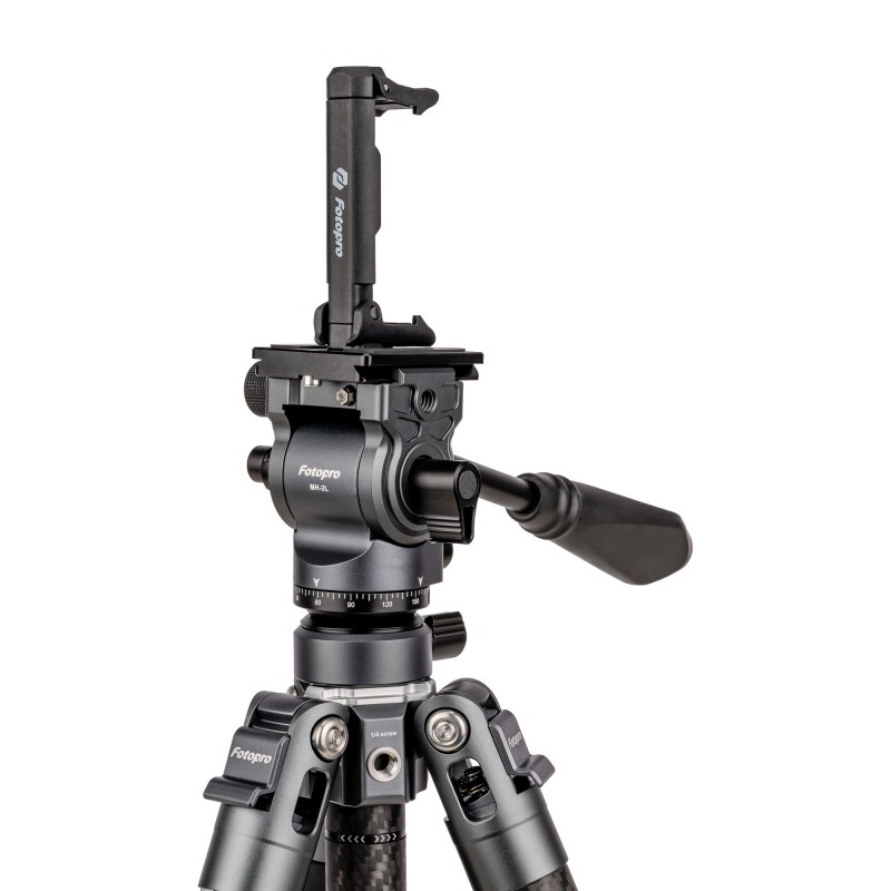 W zestawie ze statywem Fotopro X-Aircross 3 Lite Video znajdziesz praktyczny uchwyt na smartfon. Ukryto go wewnątrz kolumny centralnej, w specjalnej zakręcanej skrytce. Uchwyt jest kompatybilny z płytką szybkiego montażu, co pozwala błyskawicznie połączyć go z głowicą. Regulowany zacisk zapewnia kompatybilność z większością popularnych smartfonów.