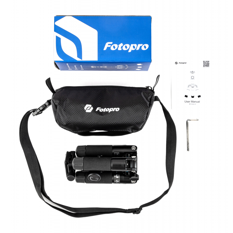 Kupując statyw Fotopro M-5 mini 2 z głowicą FPH-53P, otrzymujesz kompletny zestaw narzędzi gotowych do pracy z Twoim aparatem. W pudełku znajdziesz nie tylko statyw i głowicę, ale także wygodną torbę transportową oraz klucz imbusowy ułatwiający regulację.