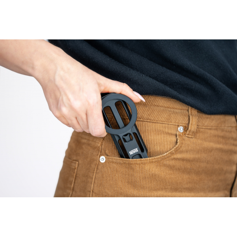 Aluminiowa obudowa zapewnia odpowiednią sztywność i odporność na codzienne użytkowanie, a jednocześnie pozwala zachować niewielką wagę – zaledwie 114 g. Po złożeniu statyw Newell z uchwytem MagSafe M-Stand mieści się w dłoni, co ułatwia transport i przechowywanie. Bez problemu wrzucisz go do torby fotograficznej, plecaka lub kieszeni, gdzie będzie zawsze gotowym do użycia.