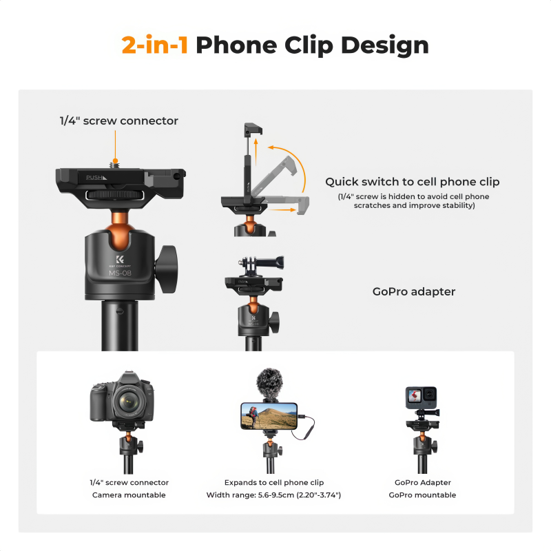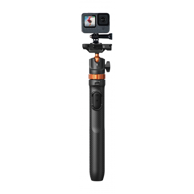 Dzięki adapterowi GoPro, który znajdziesz w zestawie, statyw fotograficzny K&F Concept Selfie może zostać błyskawicznie dostosowany do potrzeb filmowania za pomocą kamer sportowych, takich jak GoPro, DJI Osmo Action lub Insta 360. Urządzenie wieńczy solidna głowica kulowa, dzięki czemu wybrany przez Ciebie sprzęt może być obracany w zakresie 360 stopni. W razie potrzeby możesz też pochylić głowicę o 90 stopni w osi pionowej.