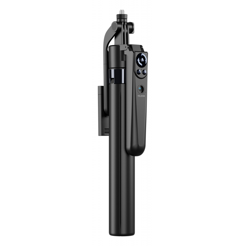 W zestawie ze statywem Telesin P3-MS-03 znajdziesz też pilota Bluetooth. Możesz go umieścić w specjalnym slocie znajdującym się nad czujnikiem ruchu. Po wyjęciu działa jako bezprzewodowy kontroler z zasięgiem do 9 metrów. Z jego pomocą możesz rozpocząć i zatrzymać nagrywanie, a także wykonać zdjęcie. To szczególnie przydatne podczas samodzielnej realizacji nagrań, gdy statyw stoi z dala od Ciebie.