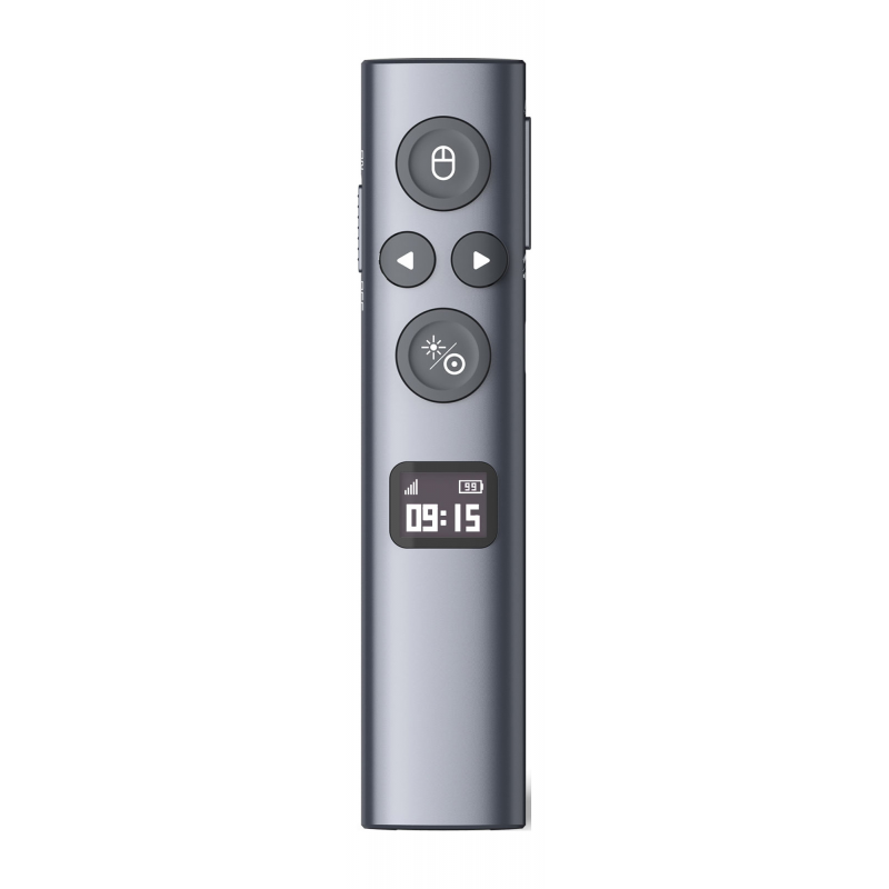 Pilot Norwii N95s BLE wyposażono w wysokiej jakości wyświetlacz OLED, który skutecznie ułatwi Ci pracę. Sprawdzisz na nim rzeczywisty poziom naładowania akumulatora wyrażony w procentach, siłę sygnału podzieloną na pięć poziomów oraz włączysz timer odliczający czas prezentacji. Wystarczy ustawić, jak długo ma trwać Twoje wystąpienie, a pilot zawibruje w kluczowych momentach – 10 minut przed końcem, 5 minut przed końcem i w momencie zakończenia odliczania. Wyświetlacz pokazuje również status połączenia (podłączony, rozłączony, oczekiwanie na parowanie Bluetooth) oraz symbol palca przy naciśnięciu przycisku. To idealne rozwiązanie dla osób prowadzących prezentacje w rygorystycznych ramach czasowych.