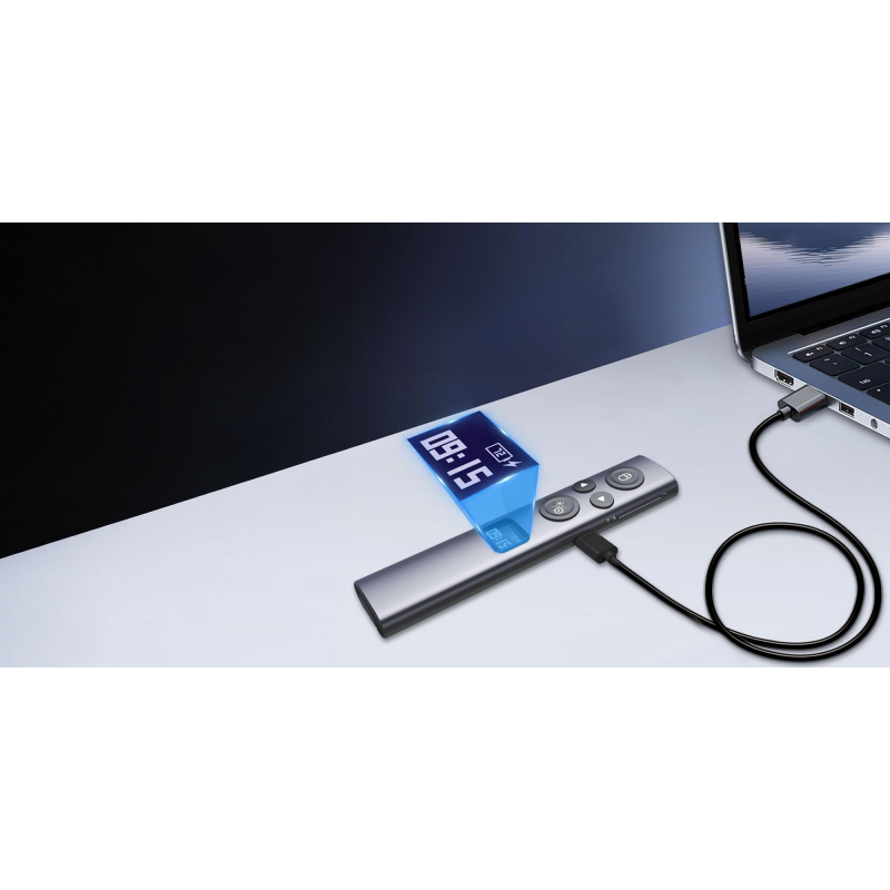 Pilot Norwii N95s BLE oferuje wskaźnik laserowy z możliwością przełączania między dwoma kolorami: czerwonym (długość fali 640-660 nm) i zielonym (495-545 nm). Zasięg wiązki laserowej przekracza 200 metrów, co pozwala na precyzyjne wskazywanie istotnych elementów nawet na bardzo dużych ekranach z dużej odległości. Czerwony laser sprawdzi się w większości standardowych zastosowań. Z kolei zielony będzie lepiej widoczny w jasno oświetlonych pomieszczeniach oraz na jasnych powierzchniach. Możliwość wyboru koloru lasera daje Ci elastyczność w dostosowaniu narzędzia do warunków panujących w sali. Laser jest bezpieczny w użytkowaniu podczas prezentacji.