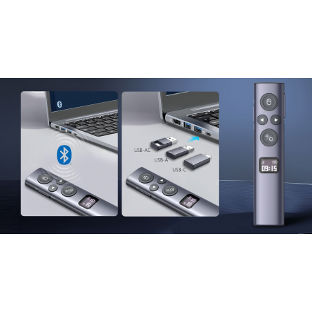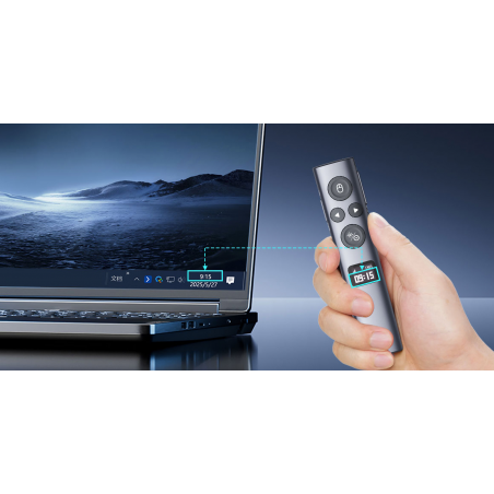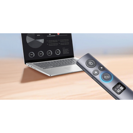 Pilot z wskaźnikiem laserowym do prezentacji multimedialnych Norwii N95s BLE to zaawansowane urządzenie łączące funkcje bezprzewodowego kontrolera, myszki i cyfrowego wskaźnika. Wyświetlacz OLED pokazuje poziom naładowania baterii, siłę sygnału oraz odlicza czas prezentacji. Urządzenie przypomina o upływających minutach za pomocą wibracji. Zasięg komunikacji wynosi aż 100 metrów. Odbiornik z 2 końcówkami (USB-A i USB-C) oraz bezpośrednia łączność Bluetooth zapewniają elastyczność w każdej sytuacji. Pilot obsługuje dwa kolory lasera (czerwony i zielony), oferuje 4 tryby zmiany slajdów oraz zaawansowane funkcje wskaźnika cyfrowego. Pilot zapewnia do 120 dni gotowości do pracy, a ładowanie przez USB-C trwa zaledwie 1-2 godziny. Kompatybilny z systemami Windows, macOS, Android oraz Linux.