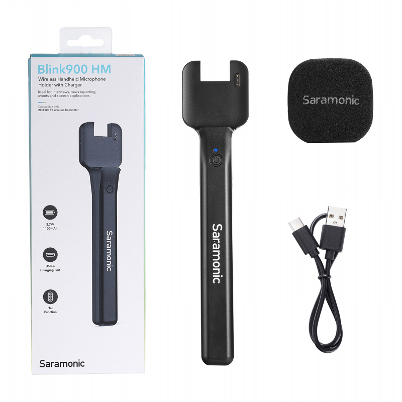 Uchwyt ręczny Saramonic Blink900 HM do nadajników to rewolucyjne urządzenie, które w łatwy sposób przekształci mikroport Blink900 TX w mikrofon reporterski. Mocowanie na klips pozwala połączyć akcesoria w ciągu sekundy. Ergonomicznie zaprojektowany uchwyt świetnie sprawdzi się podczas przeprowadzania wywiadów, prowadzenia relacji na żywo, eventów i konferencji. Wbudowany akumulator pozwoli dwukrotnie naładować nadajnik Blink900 TX.