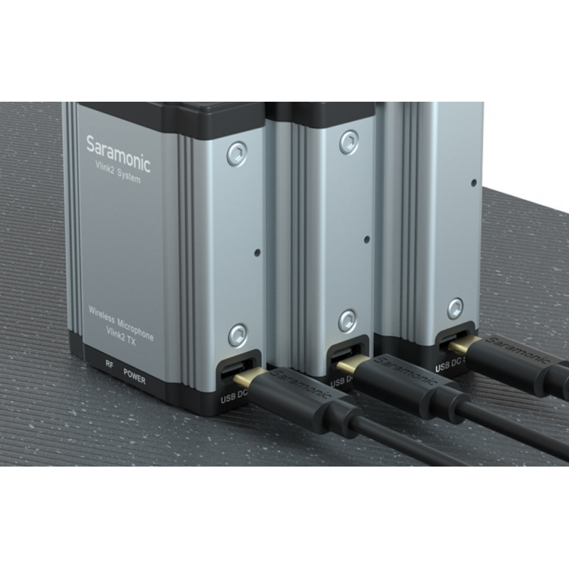 Pracując z zestawem do bezprzewodowej transmisji dźwięku Saramonic Vlink2 nie musisz martwić się o kupowanie baterii lub pakowanie do torby zapasowych ogniw. Mikroporty wyposażono we wbudowane akumulatory, które zapewnią nieprzerwaną pracę podczas całego dnia zdjęciowego. Maksymalny czas działania nadajników to 20 godzin, a odbiornika 19. Nawet jeśli nagrywasz 24-godzinny stream, możesz spać spokojnie! Urządzenia bez trudu podłączysz do ładowarki lub power banku zyskując dodatkowy zastrzyk energii!