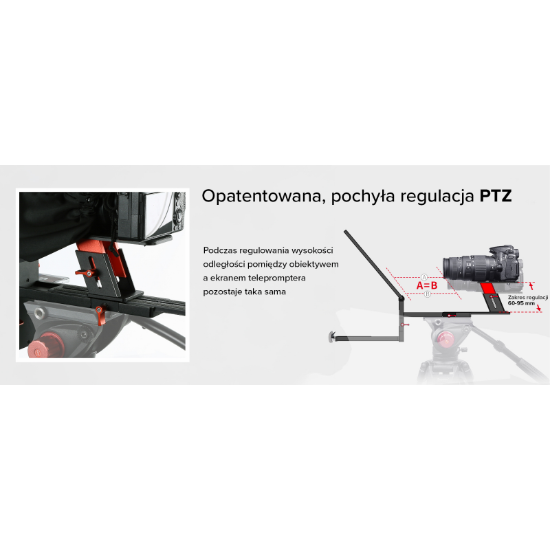 Desview TP170 wyposażony jest w opatentowany, nachylony mechanizm podnoszenia PTZ, który umożliwia regulację pozycji kamery w pionie bez zmiany odległości między obiektywem a lustrem telepromptera. Dzięki temu możesz swobodnie skorygować ustawienie, nie martwiąc się o utratę ostrości czy zniekształcenia obrazu. Ten innowacyjny system zapewnia większą elastyczność podczas nagrań, pozwalając na precyzyjne ustawienie kadru.