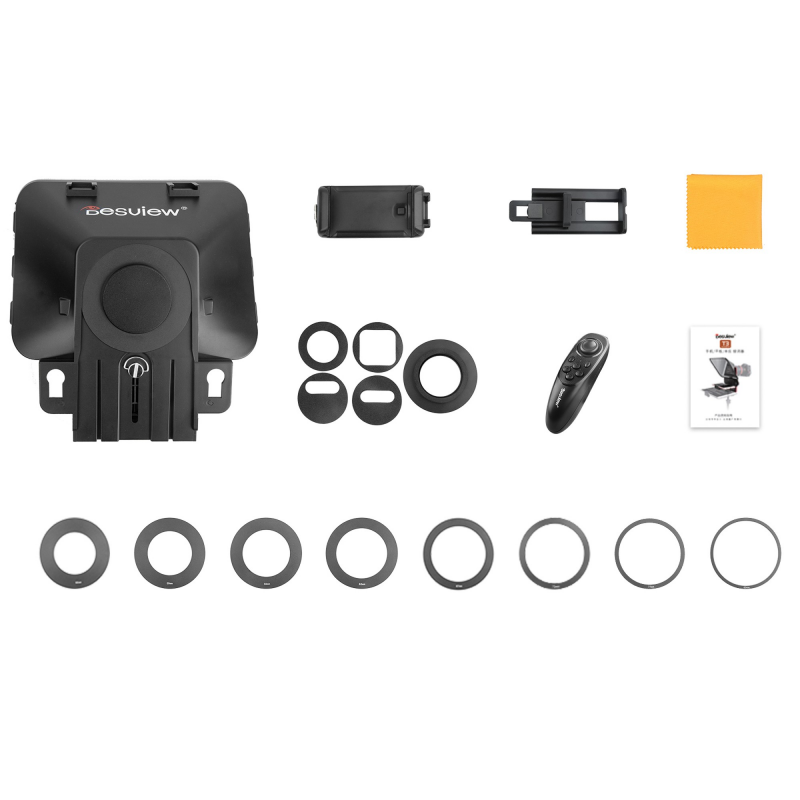 W zestawie z teleprompterem Desview T3 znajdziesz akcesoria, które umożliwią wygodne nagrywanie filmów za pomocą różnych urządzeń. Specjalny uchwyt pozwoli w wygodny sposób rejestrować obraz za pomocą smartfona przymocowanego z lewej lub prawej strony telepromptera. Producent zadbał również o specjalne piankowe pierścienie zaciemniające, które umożliwią dopasowanie otworu do wielu modeli urządzeń mobilnych. Jeśli korzystasz z różnych obiektywów połączonych z bezlusterkowcem, lustrzanką lub kamerą, po prostu wybierz odpowiedni pierścień redukcyjny. W zestawie jest ich aż 9, dzięki czemu niemal każde szkło będzie kompatybilne z teleprompterem.