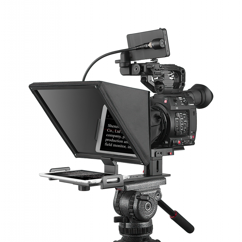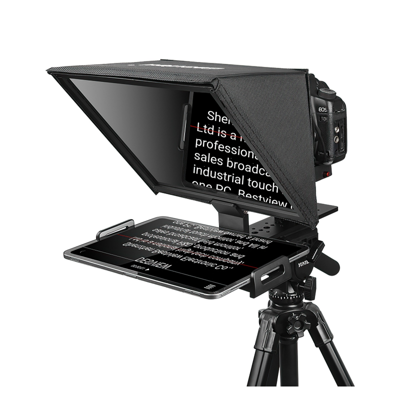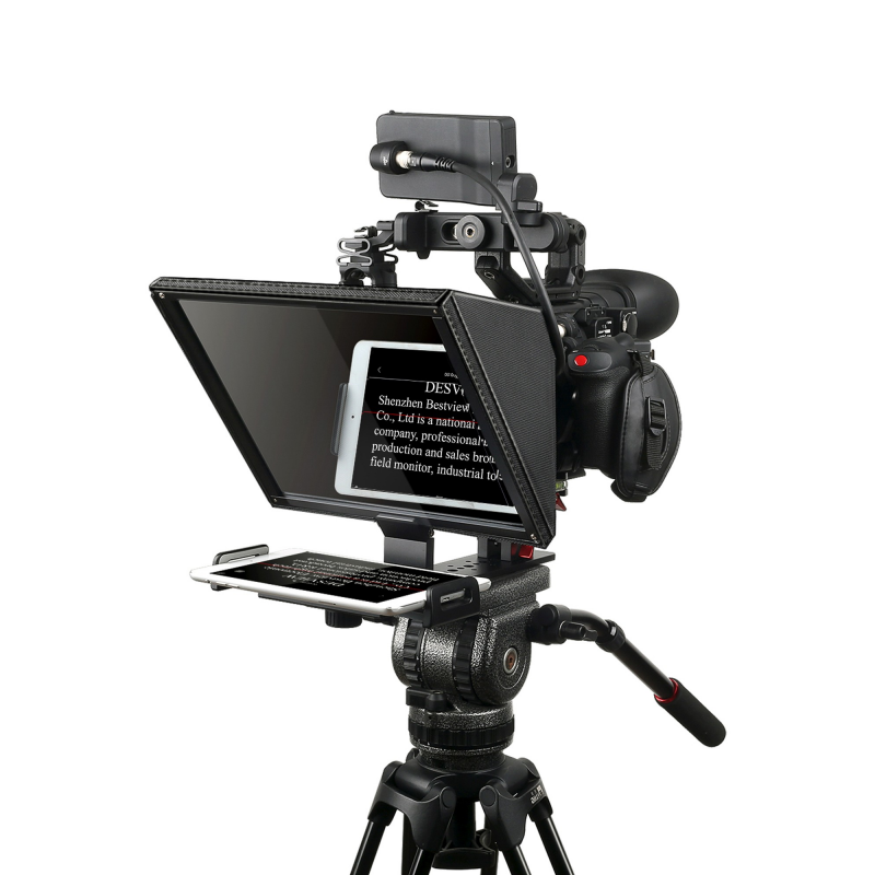 Teleprompter Desview T12 to urządzenie, które pozwoli Ci zaoszczędzić setki godzin spędzanych na niekończącym się powtarzaniu ujęć do vlogów, webminarów lub innych filmów wymagających lektora. Oferuje on profesjonalny uchwyt, który wygodnie zainstalujesz na statywie, a następnie połączysz z tabletem lub smartfonem o maksymalnej przekątnej wynoszącej 11”. Czytany tekst odbije się na wysokiej jakości lustrze wykonanym z 26-warstwowego szkła rozdzielającego wiązkę światła. Komfort pracy podniesie dołączony do zestawu pilot Bluetooth oraz darmowa aplikacja (iOS/Android), które pozwolą sterować wyświetlanym scenariuszem.