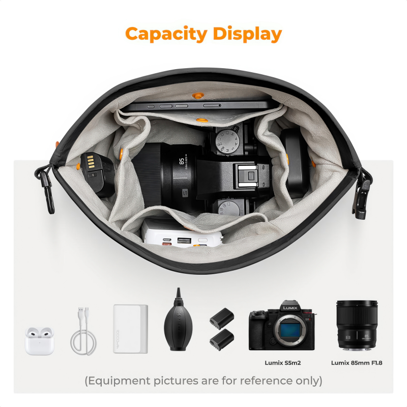 • z powodzeniem pomieści m.in. taki zestaw urządzeń: aparat z 1 obiektywem, 2 akumulatory, gruszkę do czyszczenia optyki, power bank, kabel ładujący oraz parę dousznych słuchawek