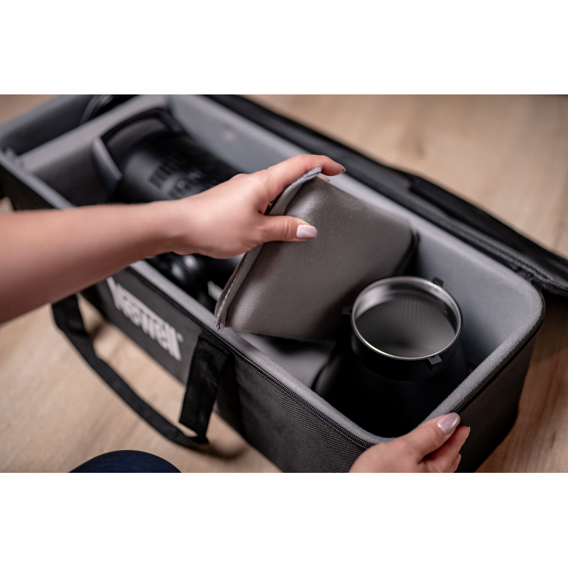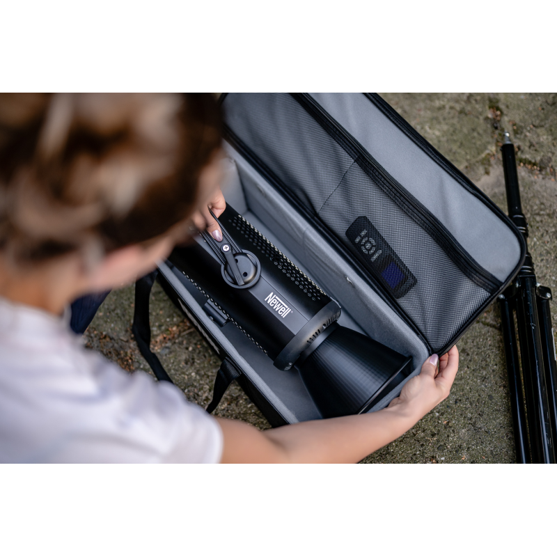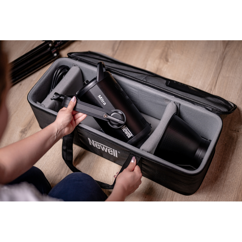 Torba powstała z myślą o lampach Newell Mitra oraz Surja, ale jej uniwersalna konstrukcja sprawia, że sprawdzi się również w przypadku setek innych urządzeń, które wykorzystujesz podczas pracy nad projektami foto-video. Wewnątrz bez problemu zmieścisz także mniejsze panele LED, a także inny sprzęt filmowy lub fotograficzny. Torba pozwala wygodnie spakować niezbędny zestaw narzędzi. To idealne rozwiązanie dla twórców, którzy często pracują w różnych lokalizacjach lub chcą stworzyć mobilny oświetleniowy niezbędnik.