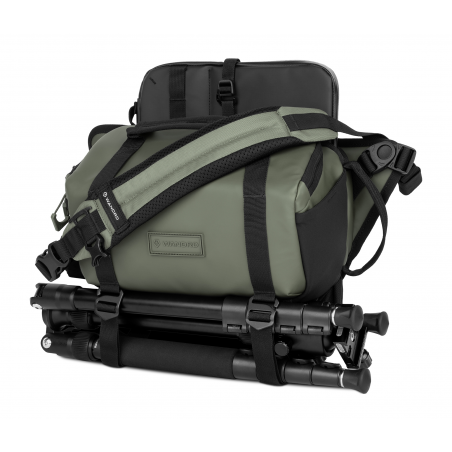 W dolnej części torby Wandrd Rogue Sling 6 l v2 znajdziesz specjalny rozkładany rękaw, który pomieści statyw lub dużą butelkę wody. Gdy dodatkowa przestrzeń nie jest Ci potrzebna, możesz go łatwo złożyć. Producent nie zapomniał też o paskach z regulacją, które umożliwiają przypięcie zrolowanej kurtki, bluzy lub małego statywu. To świetne rozwiązania, gdy masz zamiar zabrać więcej, ale nie chcesz poświęcać przestrzeni dostępnej wewnątrz torby.