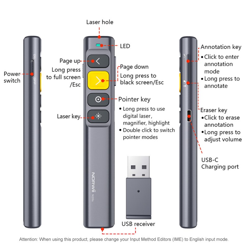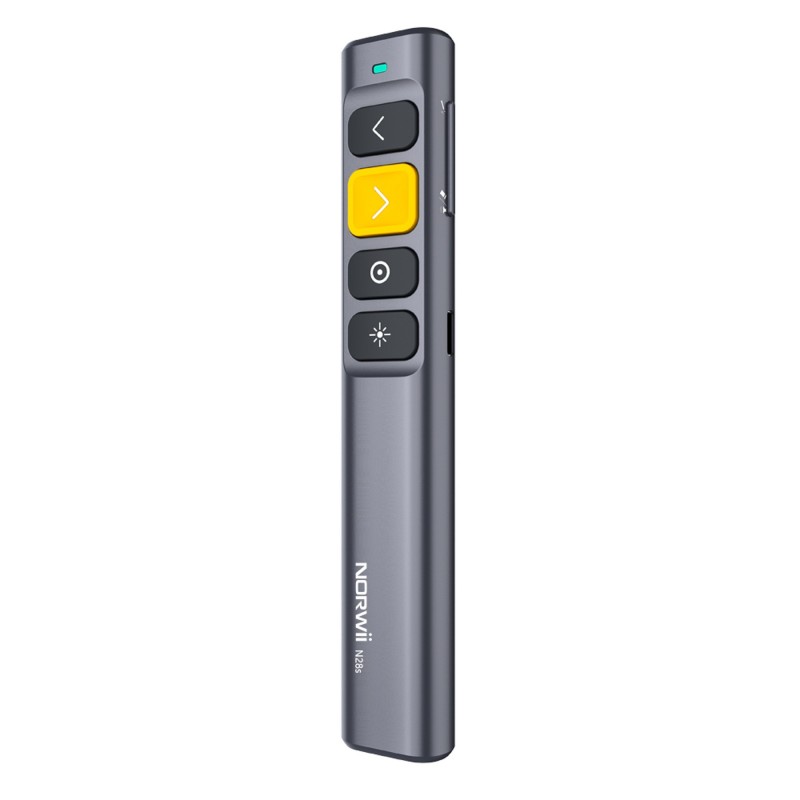 Wewnątrz ultralekkiego pilota Norwii N28s ukryto akumulator litowo-polimerowy o pojemności 300 mAh. Z łatwością naładujesz go, korzystając z popularnego portu USB-C. Gdy urządzenie będzie już na granicy wyczerpania, specjalna dioda LED zacznie mrugać na czerwono. To dodatkowe udogodnienie pozwoli uniknąć sytuacji, w których na kilka minut przed prezentacją okazuje się, że pilot nie jest gotowy do pracy.